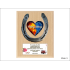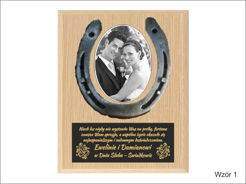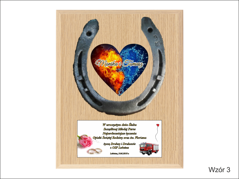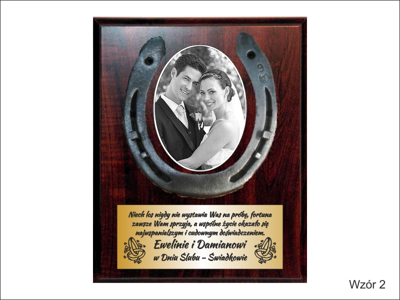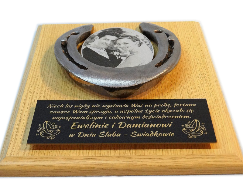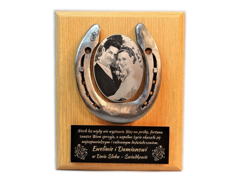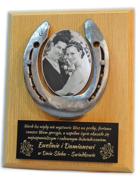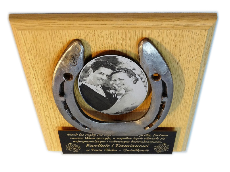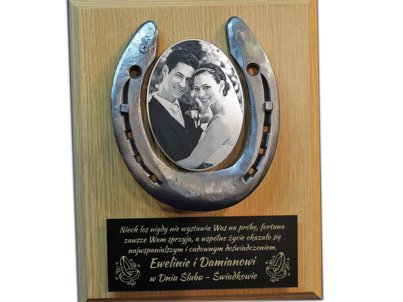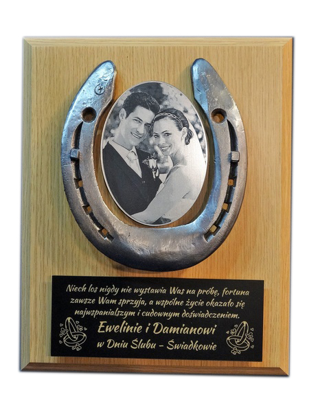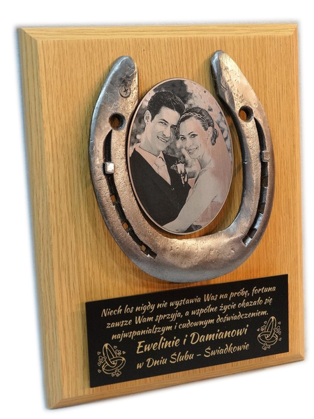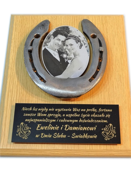 Pamiątka z okazji Ślubu w formie złożonego dyplomu okolicznościowego z podkową na drewnianym podkładzie.
