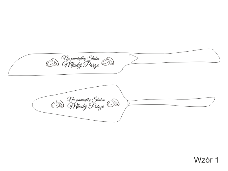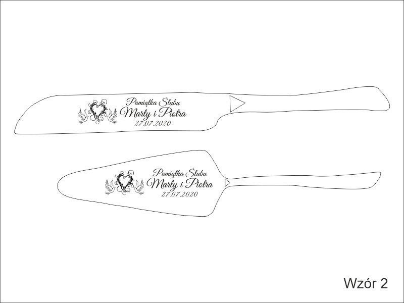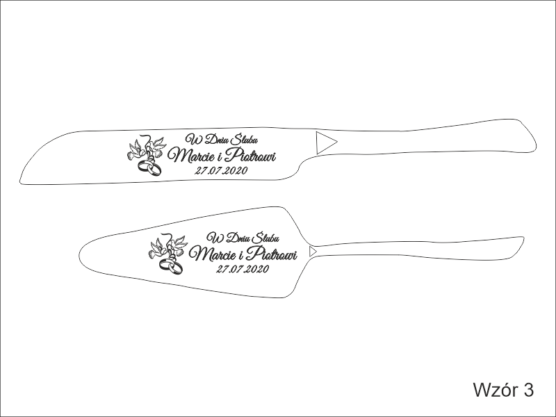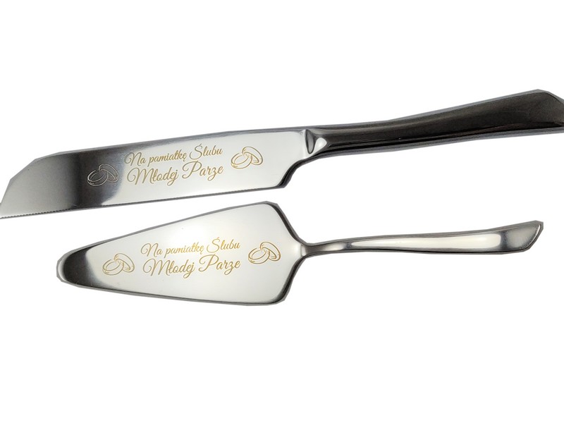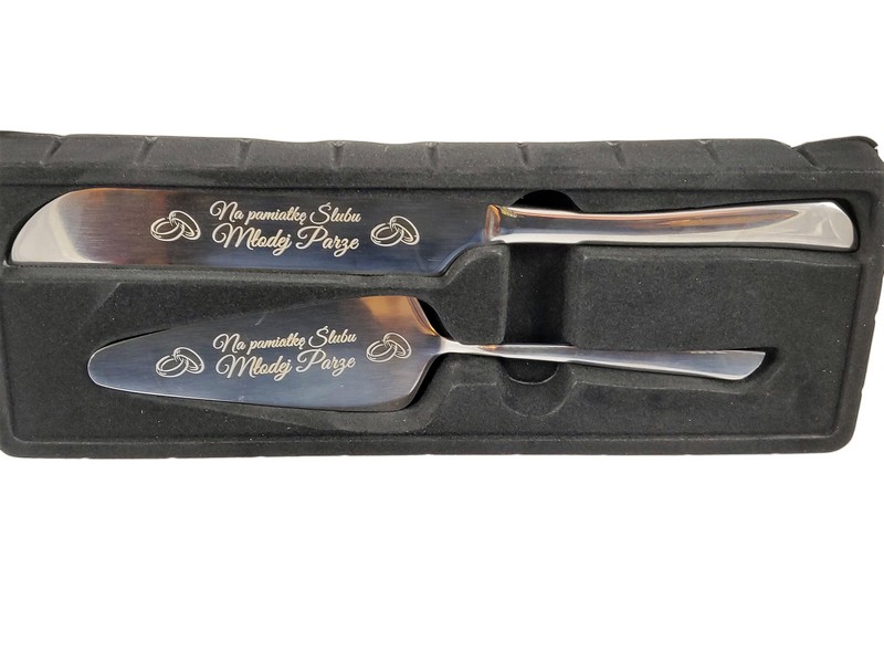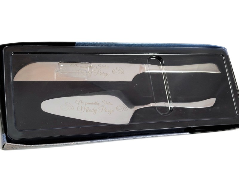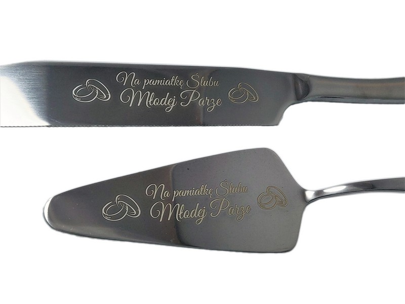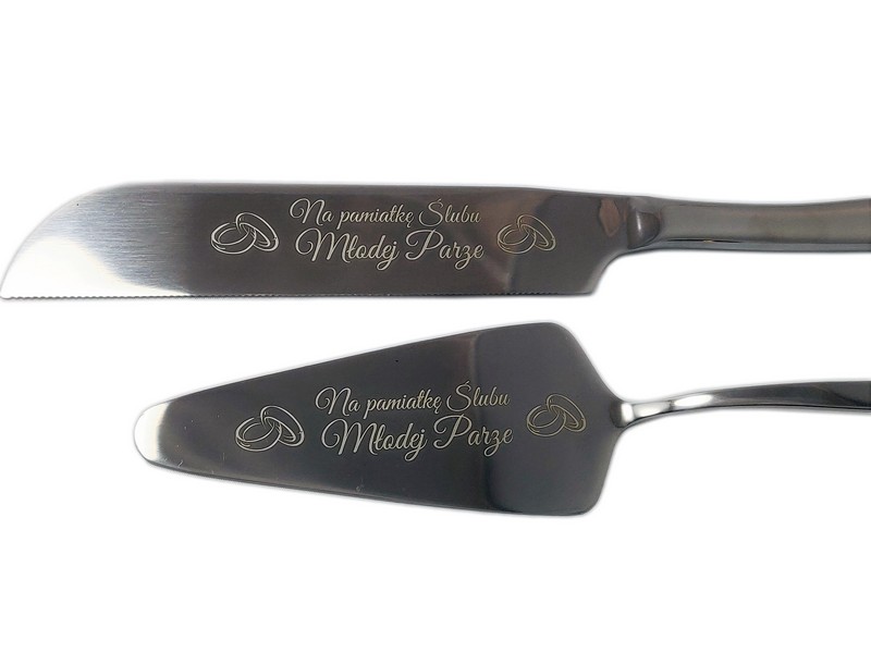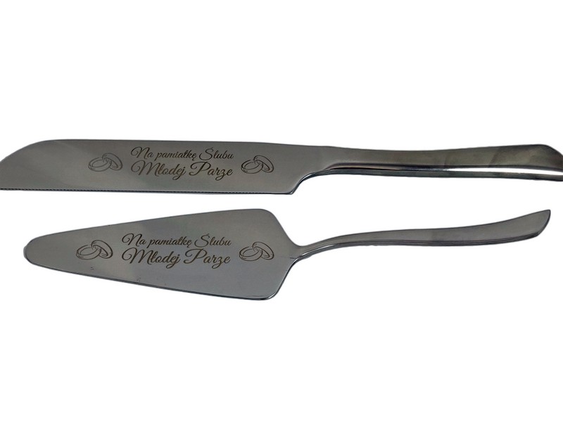 Grawer dedykacji wykonany jest bezpośrednio na nożu oraz na łopatce do ciasta.