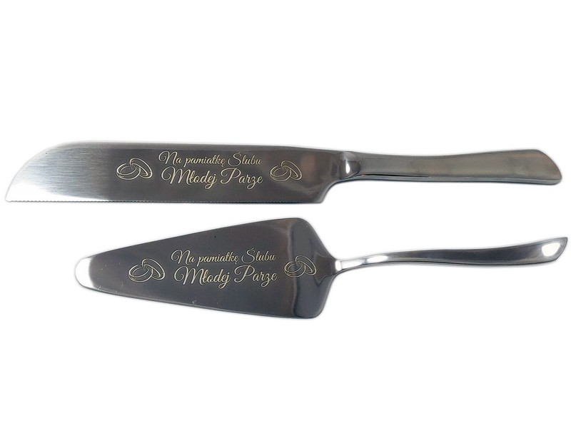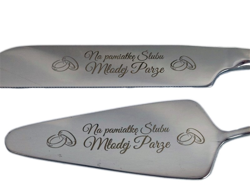 Upominek na pamiątkę ślubu w postaci kompletu składającego się z noża i łopatki do tortu z grawerem.