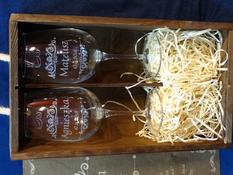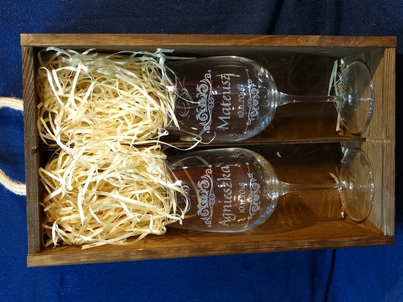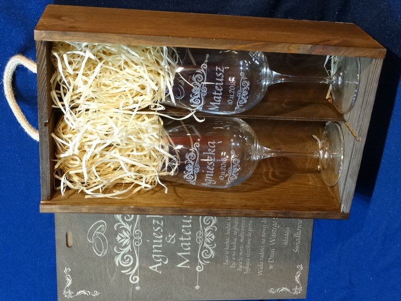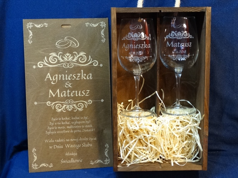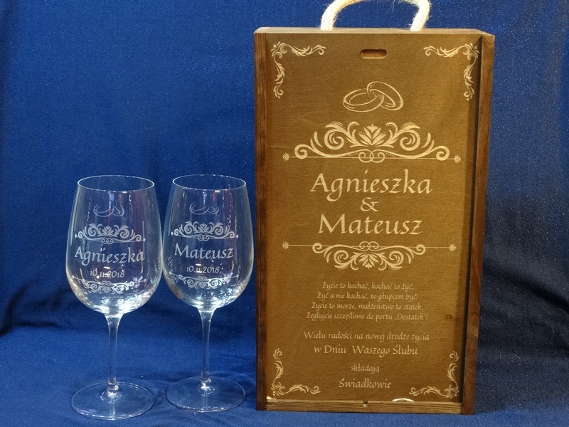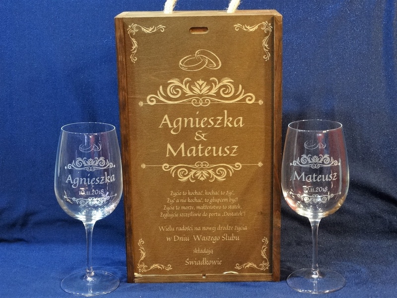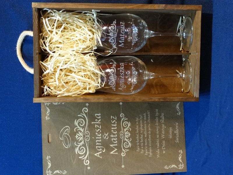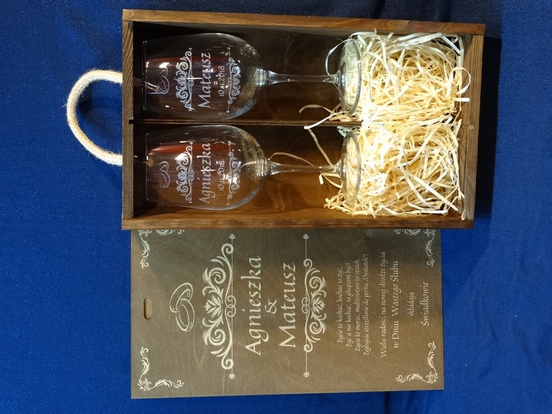 Na skrzynce i kieliszkach wykonany jest pamiatkowy grawer dedykacji z okazji ślubu.