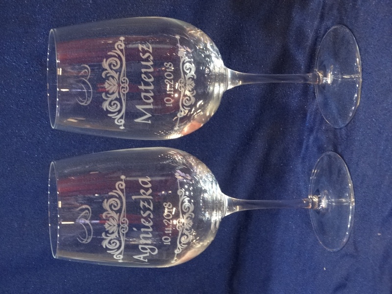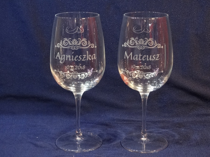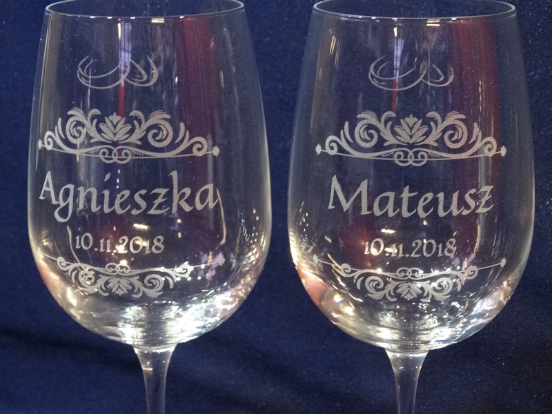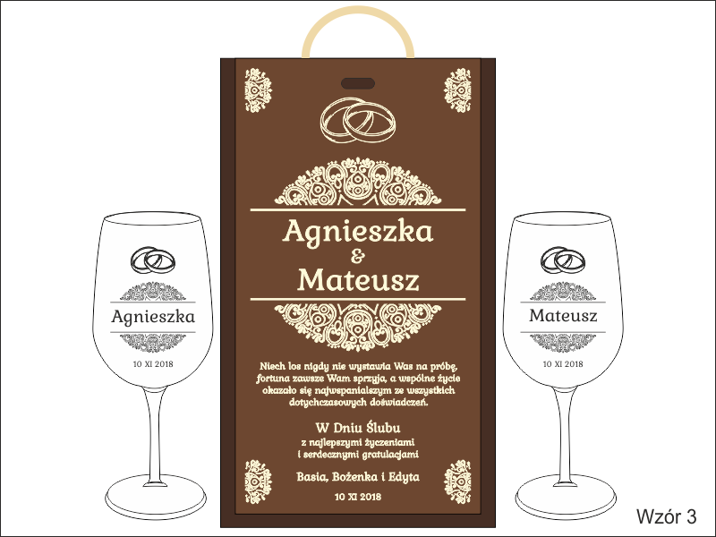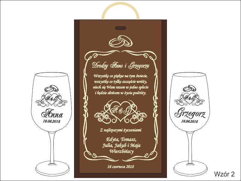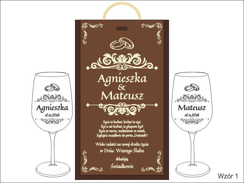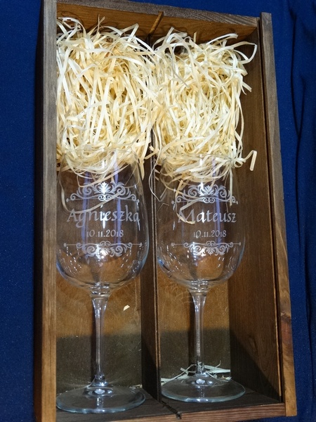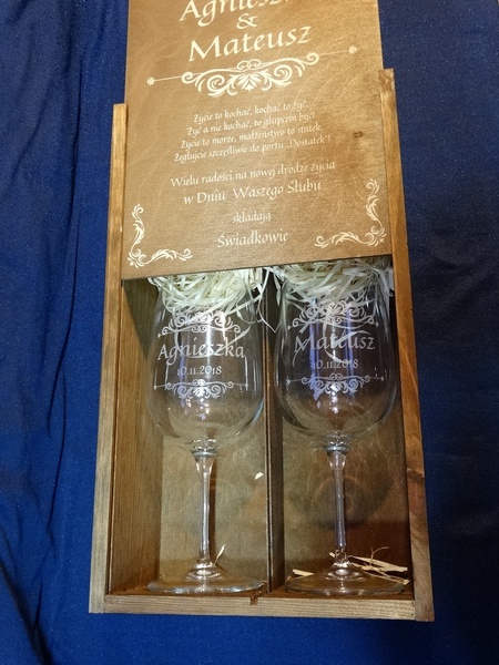 Na skrzynce i kieliszkach wykonany jest pamiatkowy grawer dedykacji z okazji ślubu.