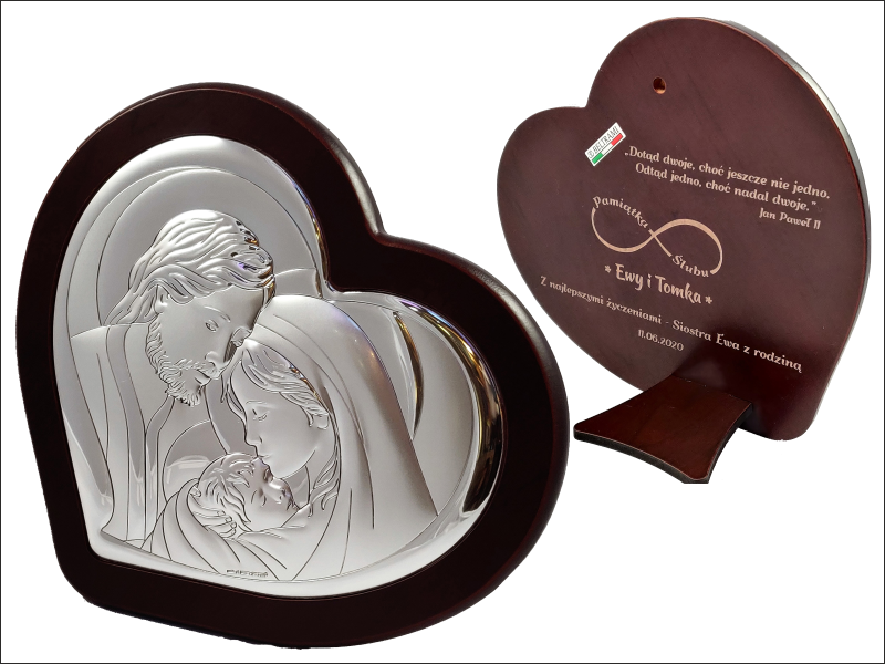 Prezent na pamiątkę Ślubu w postaci srebrnego obrazka z wizerunkiem Św. Rodziny w kształcie serca na drewnie.