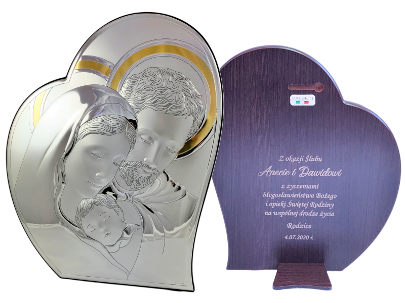 Prezent z okazji Ślubu w postaci srebrnego obrazka ze złoceniem z wizerunkiem Św. Rodziny w kształcie serca.