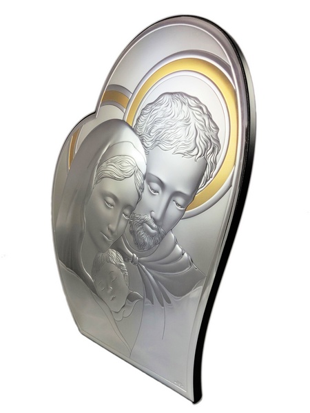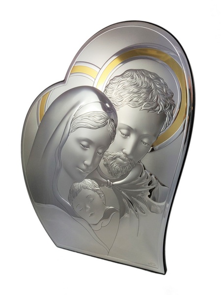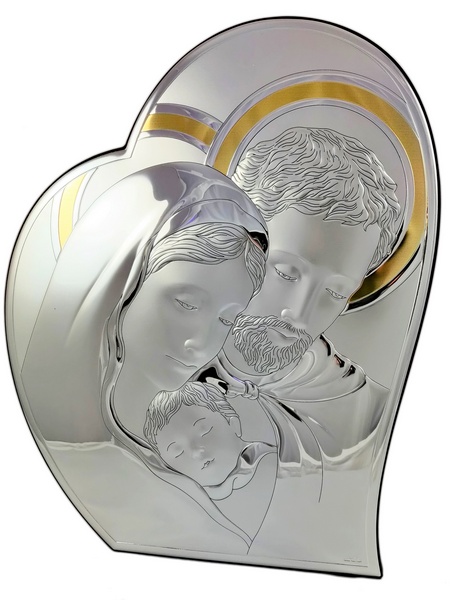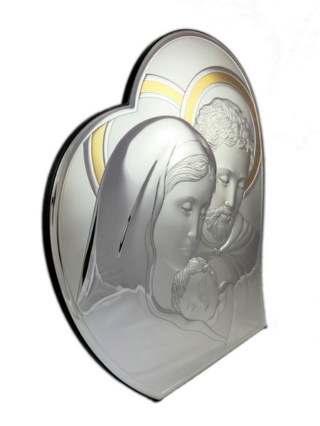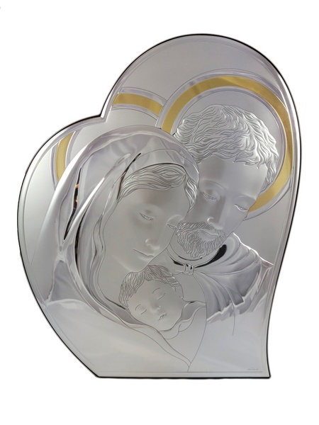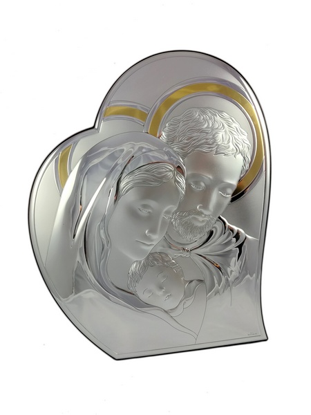 Srebrny obrazek to "Święta Rodzina 81050ORO serce". Obrazek ma złoconą aureolę.