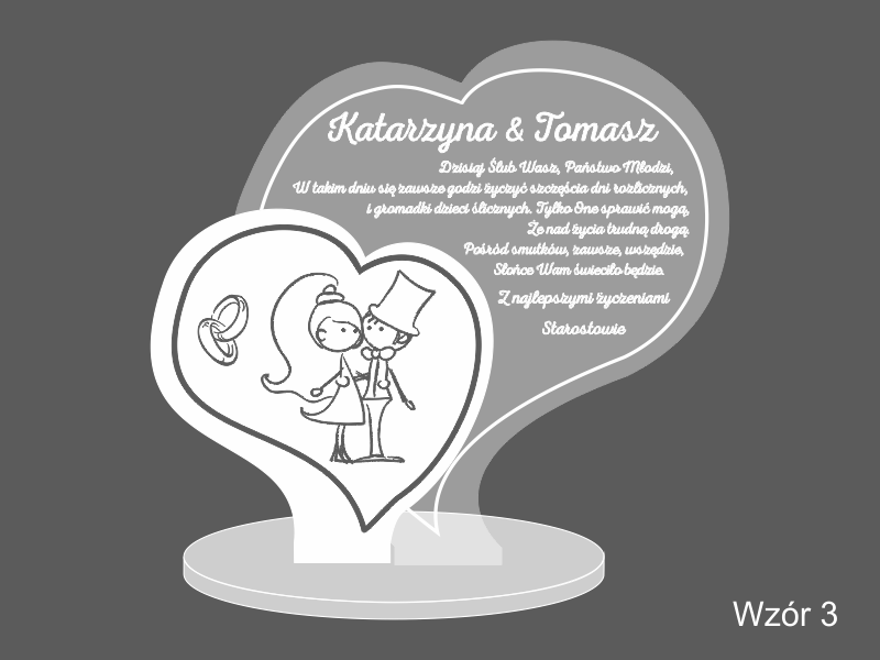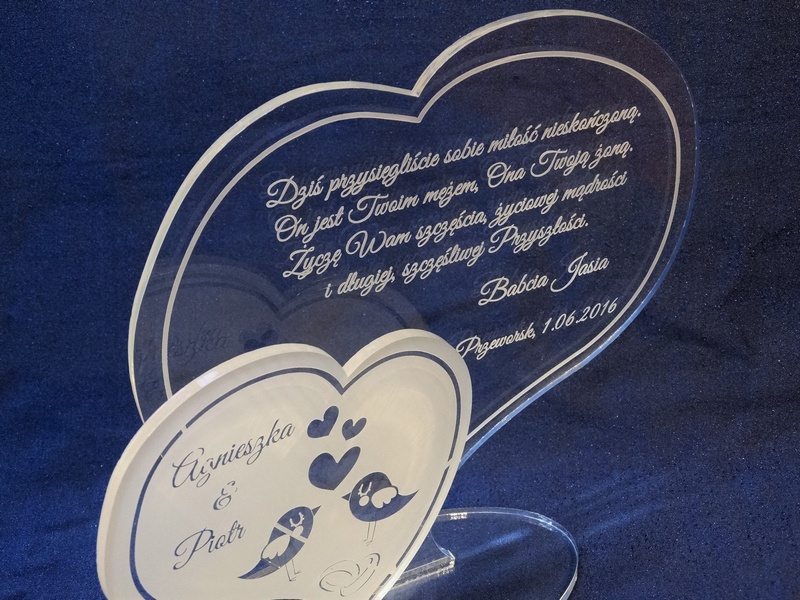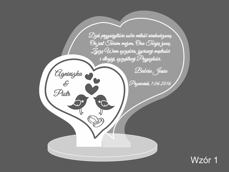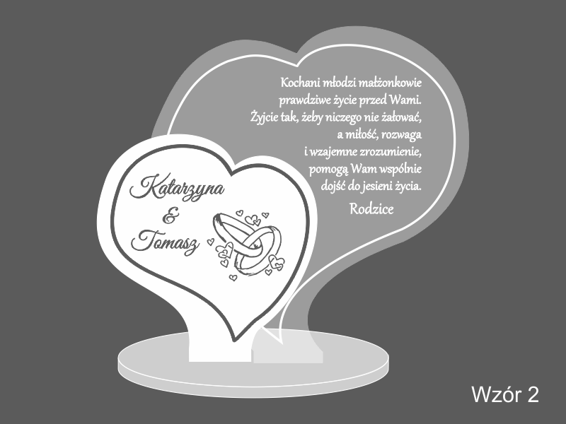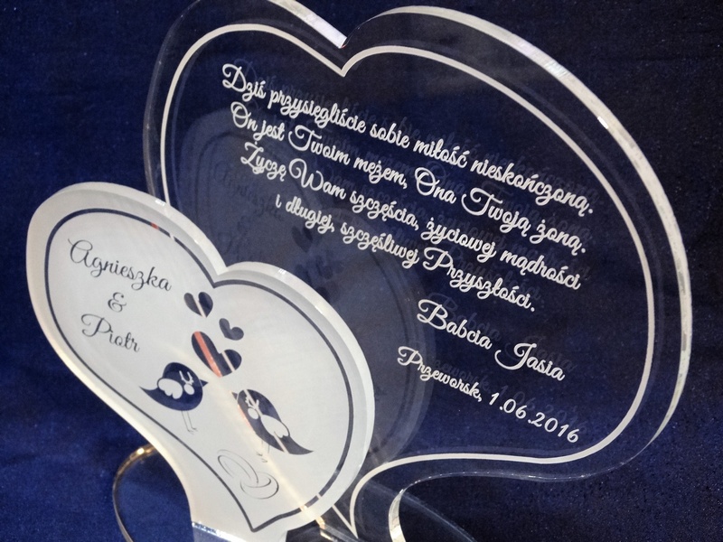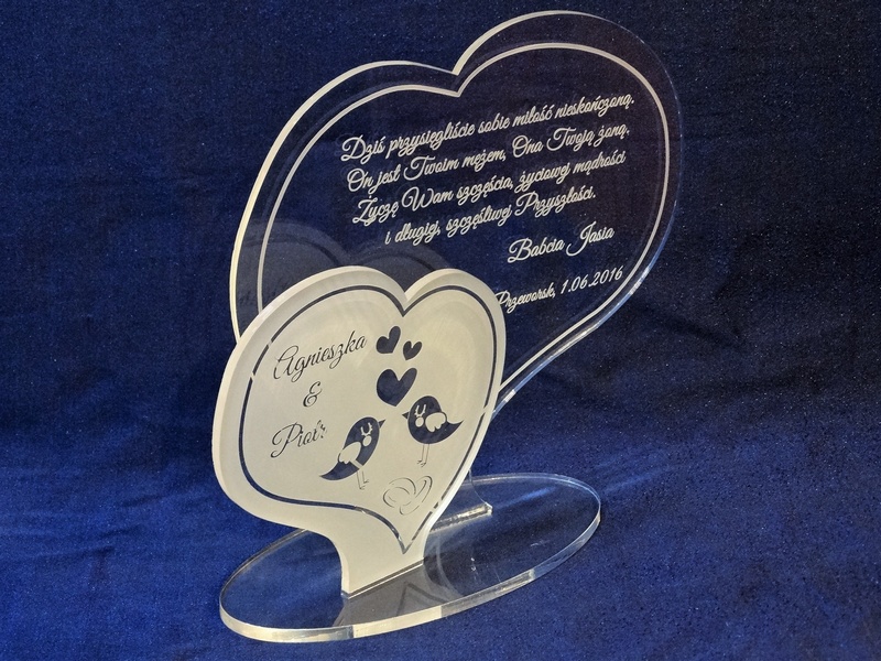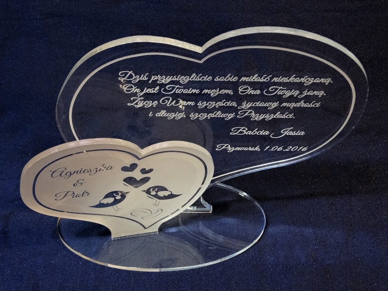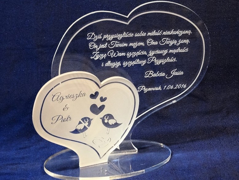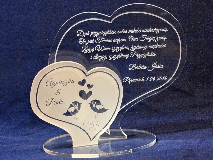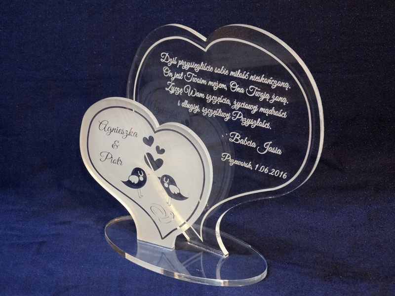 Statuetka wykonana z pleksi bezbarwnej w kształcie dwóch osobnych serc z grawerem dedykacji na pamiątkę ślubu.