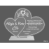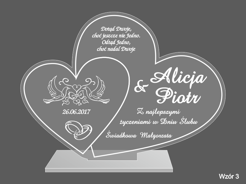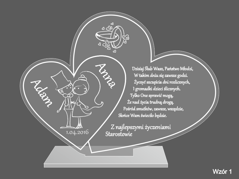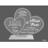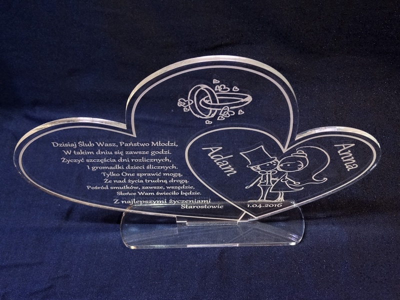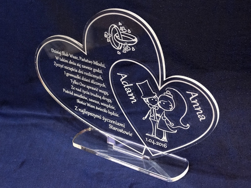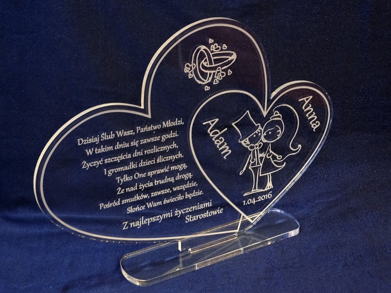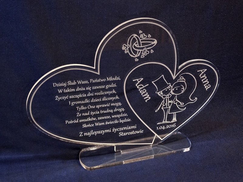 Statuetka z bezbarwnej pleksi w kształcie połączonych serc z grawerem dedykacji na pamiątkę ślubu.