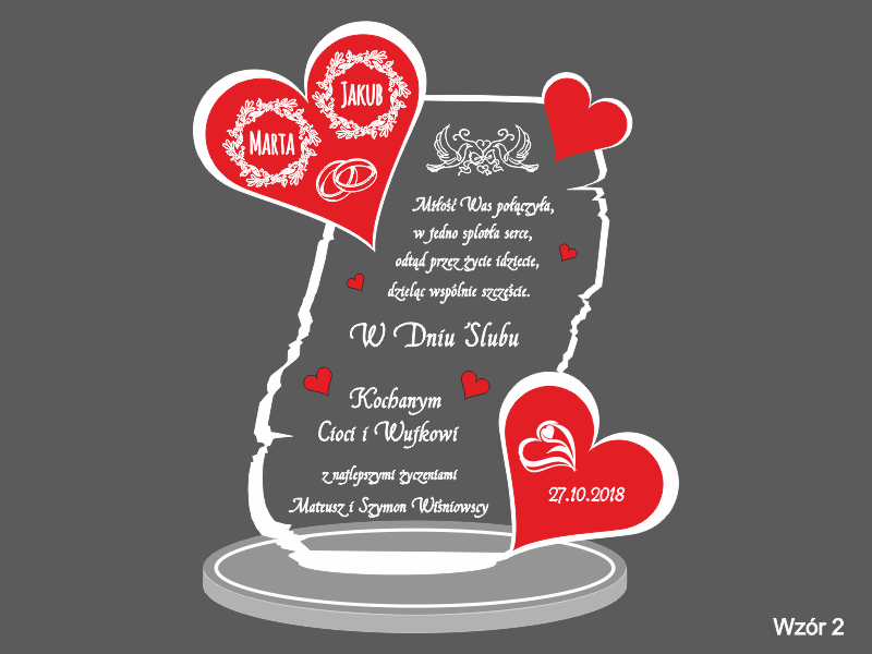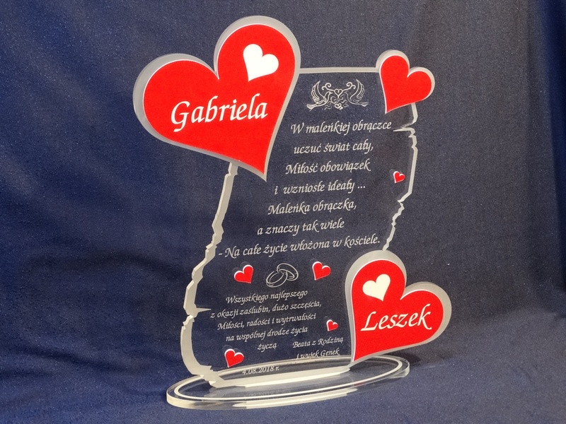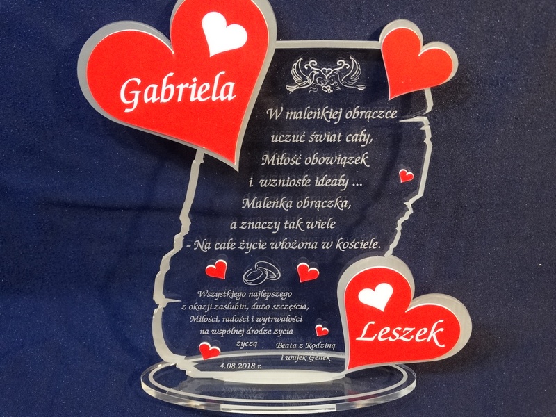 Na wyciętej z pleksy statuetce wykonany jest grawer dedykacji, życzeń oraz ozdobnej grafiki z okazji ślubu.