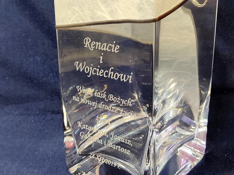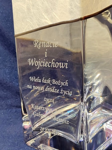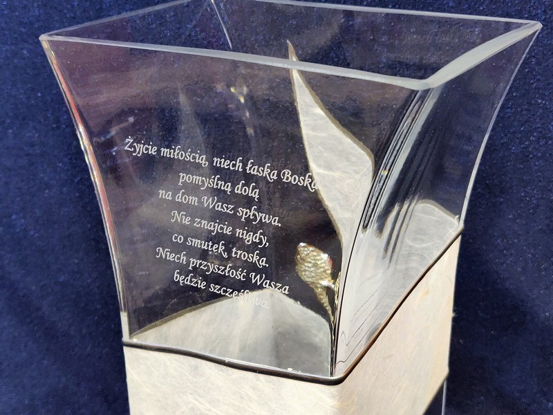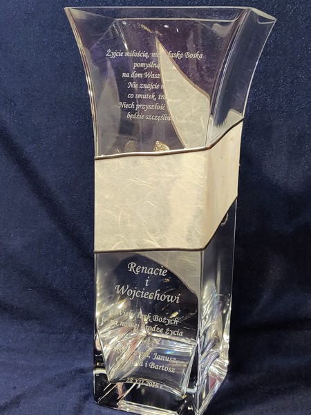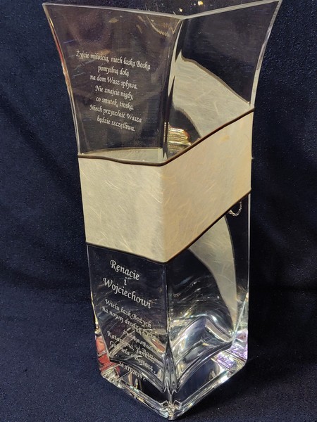 Na wazonie wykonany jest grawer dedykacji i ozdobnych grafik z okazji ślubu.