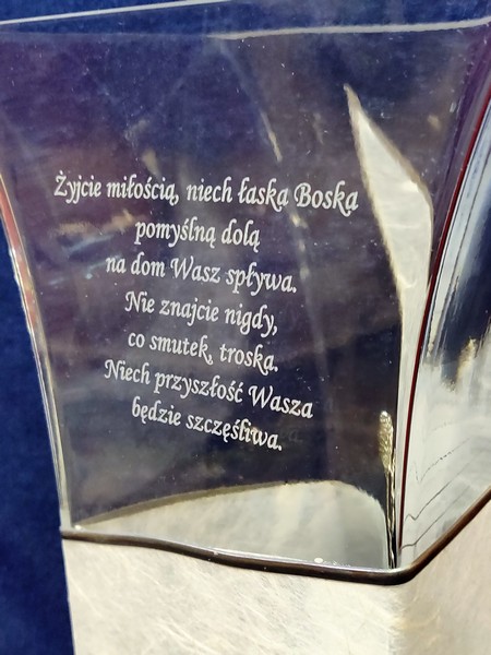 Grawer pamiątkowej dedykacji z okazji ślubu można także wykonać na innych modelach wazonów.