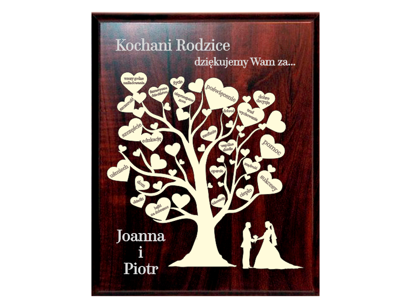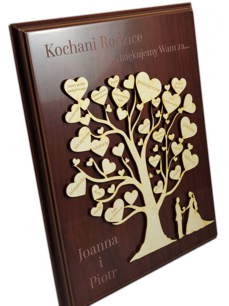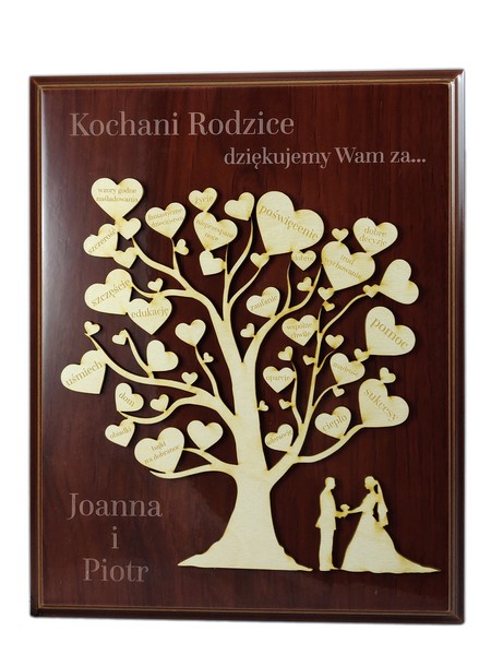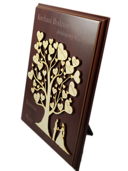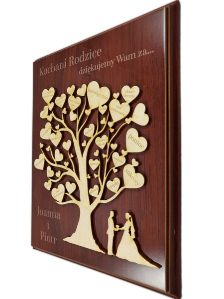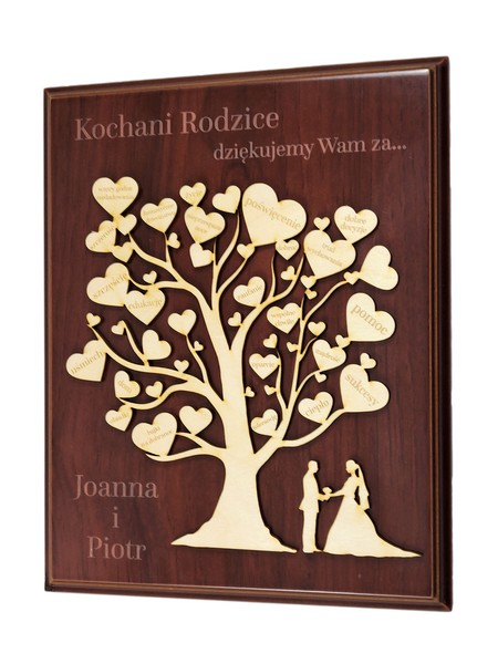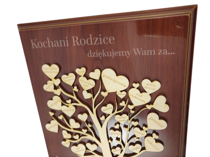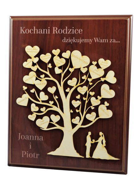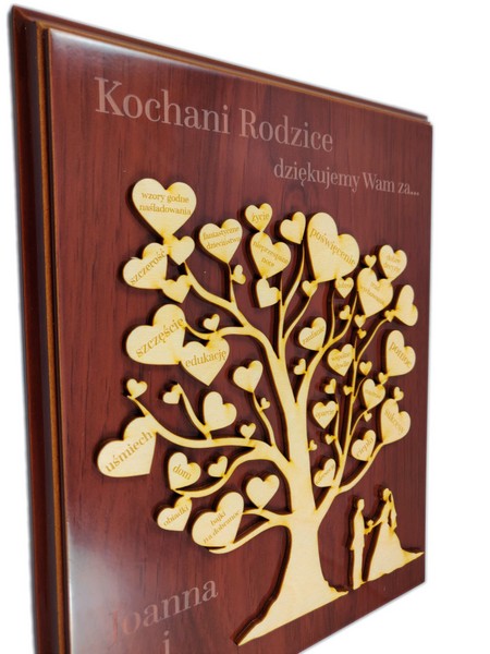 Na serduszkach obrazujących liście drzewka wygrawerowane są poszczególne życzenia dla rodziców.