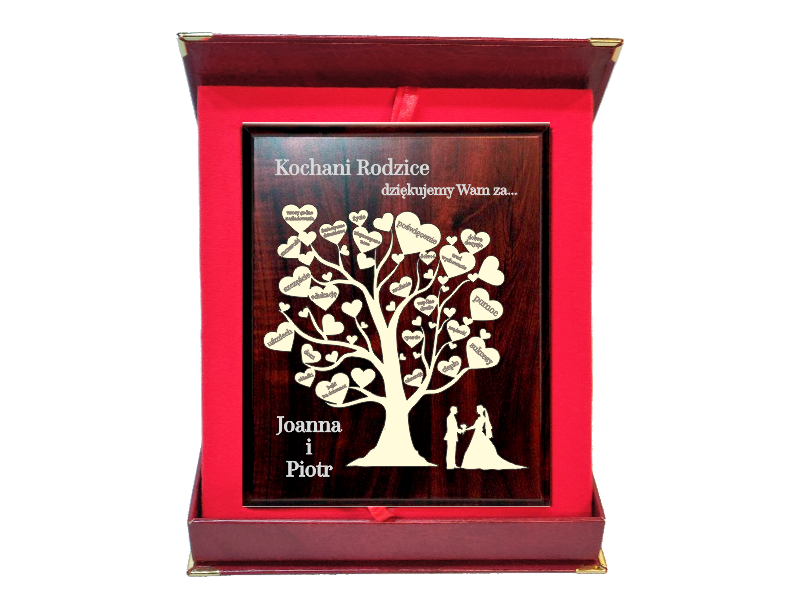 Podziękowanie dla Rodziców od Nowożeńców w postaci drewnianego dyplomu okolicznościowego Drzewko Szczęścia.