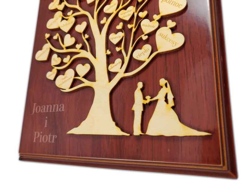 Dodatkowo dedykacja, imiona Młodych oraz data wygrawerowane są bezpośrednio w drewnianym podkładzie.