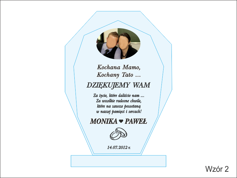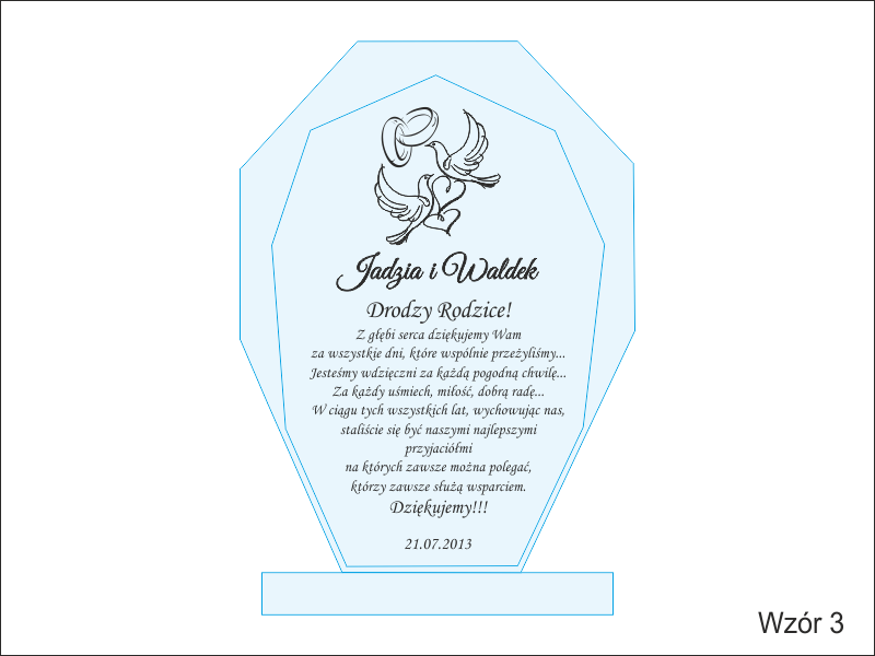 Na statuetce wykonany jest grawer ozdobnych grafik i dedykacji z podziękowaniem dla rodziców na pamiątkę ślubu.