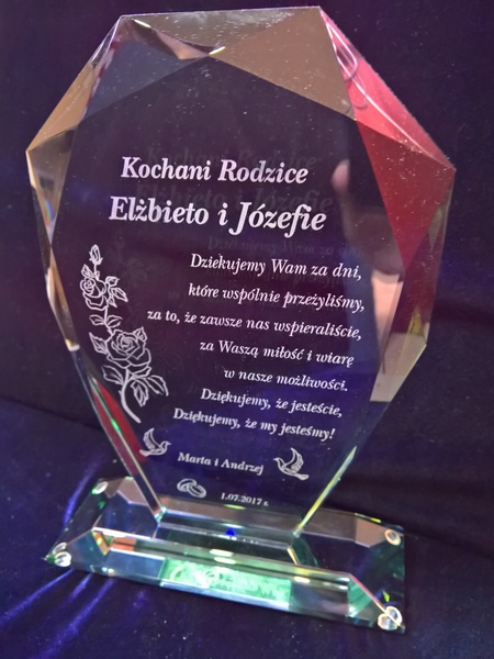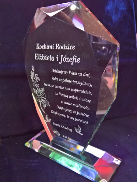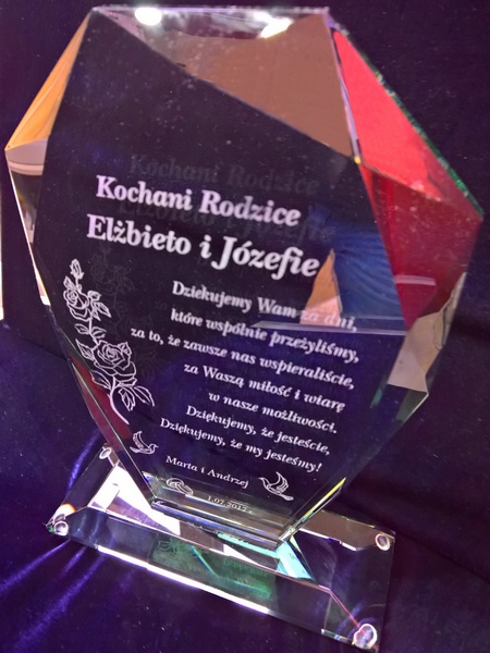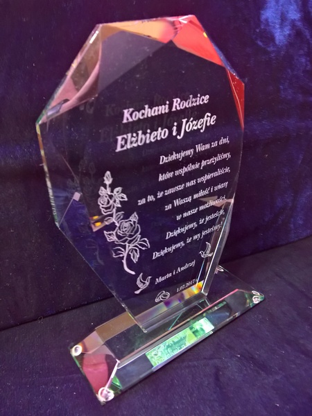 Pamiątkę z grawerem dla rodziców można także wykonać na innych modelach statuetek szklanych.