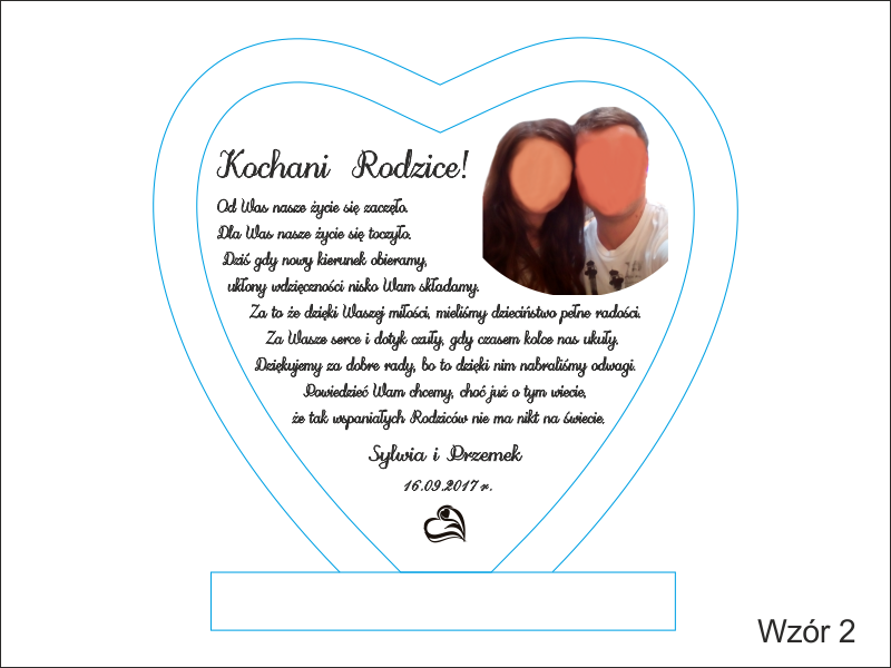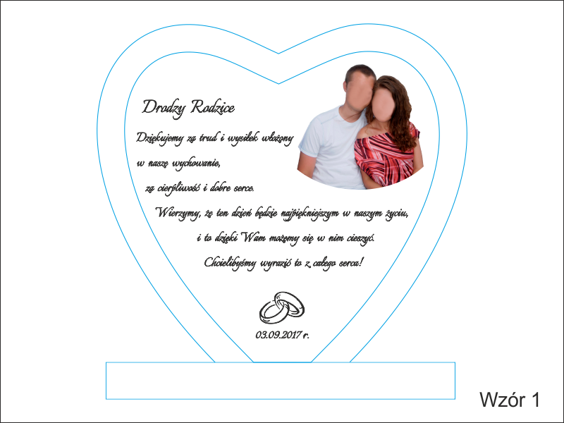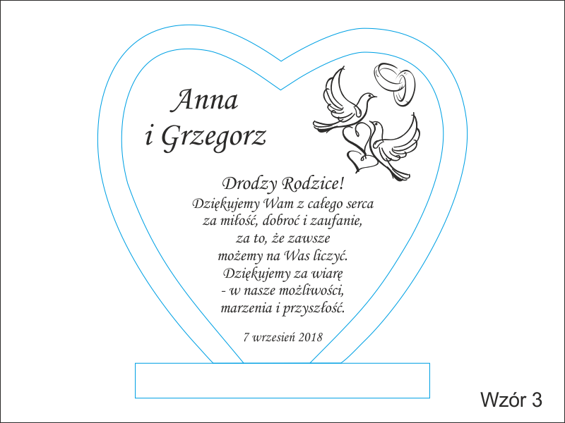 Na statuetce wykonany jest grawer ozdobnych grafik i dedykacji z podziękowaniem dla rodziców na pamiątkę ślubu.