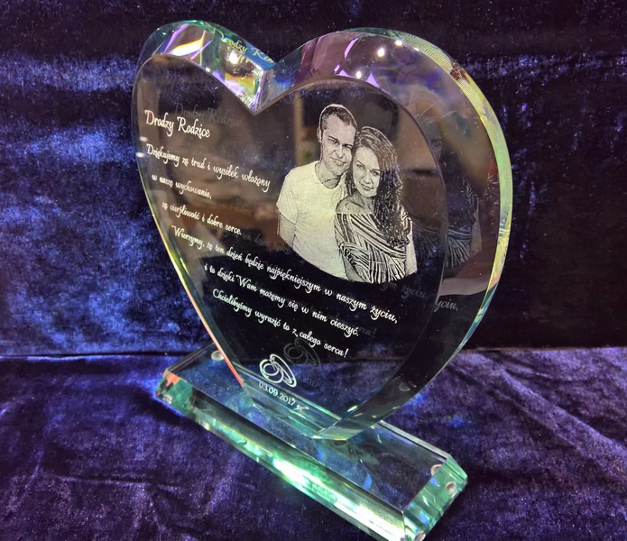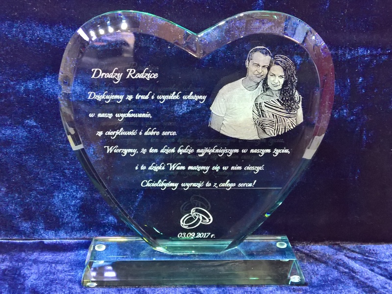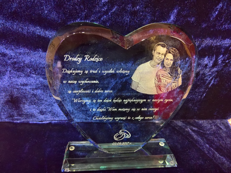 Pamiątkę z grawerem dla rodziców można także wykonać na innych modelach statuetek szklanych.