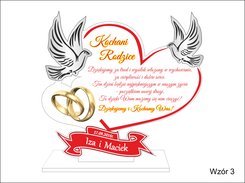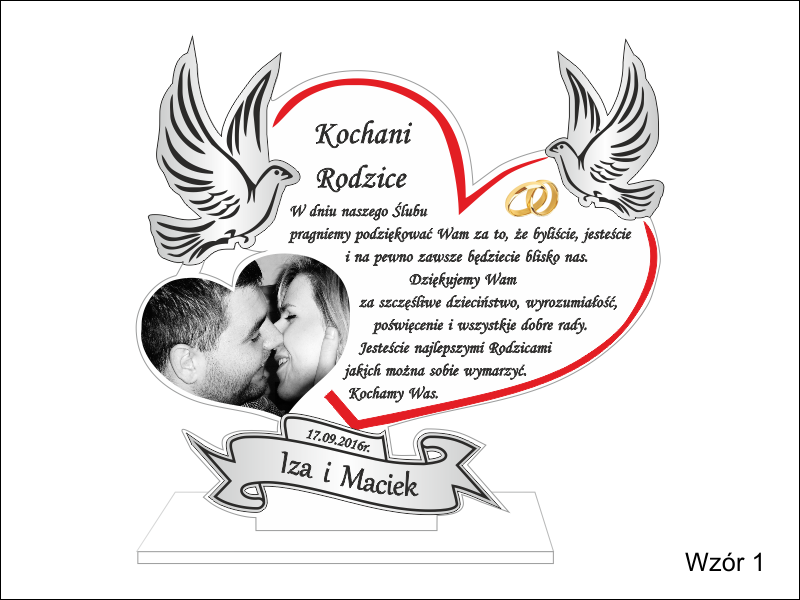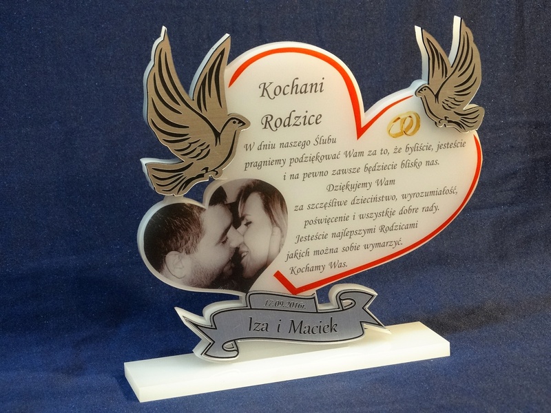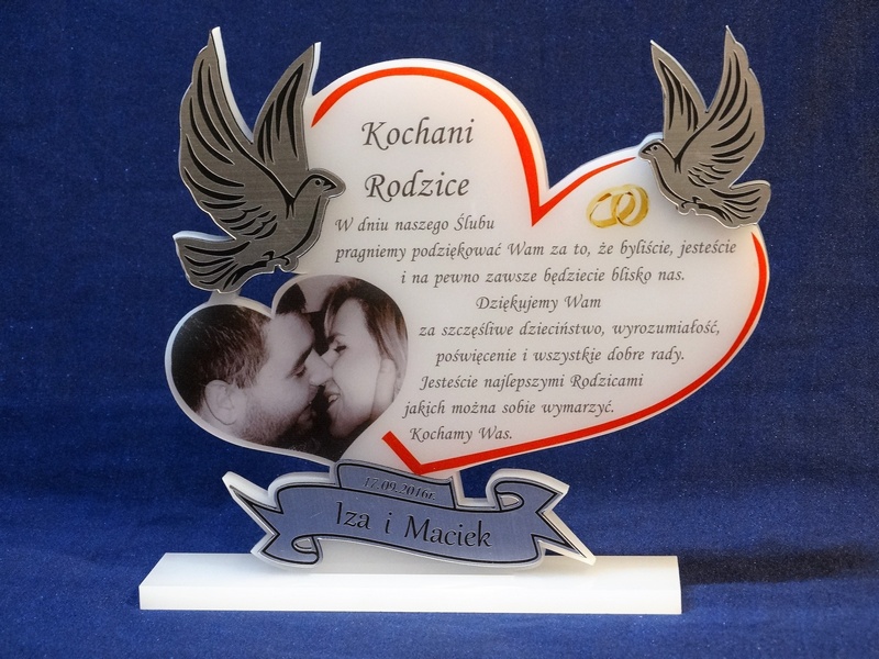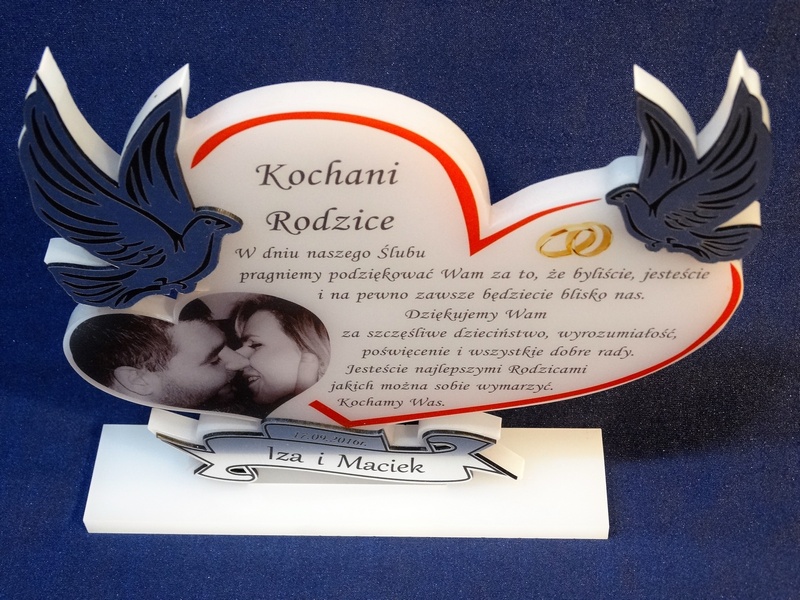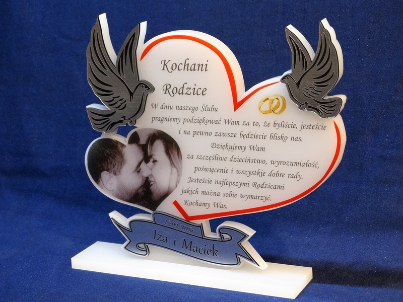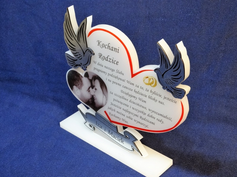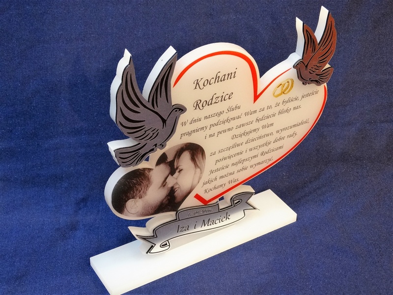 Na wyciętym z białej pleksy sercu wykonany jest nadruk dedykacji, ozdobnych grafik oraz życzeń z podziękowaniem dla rodziców.