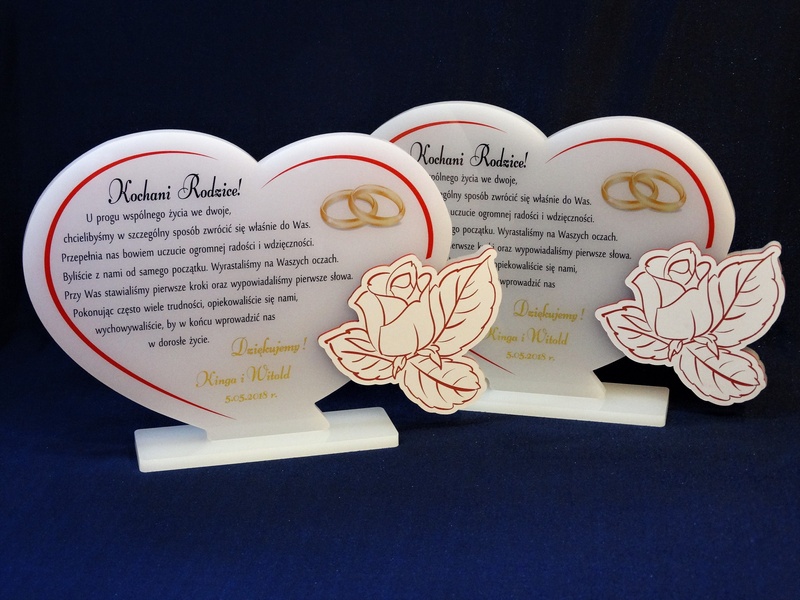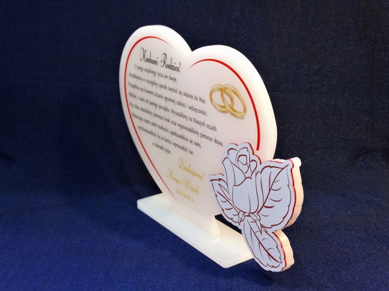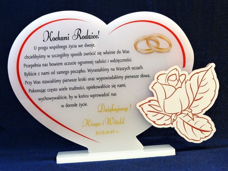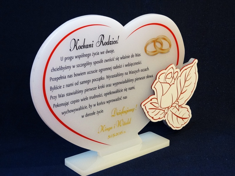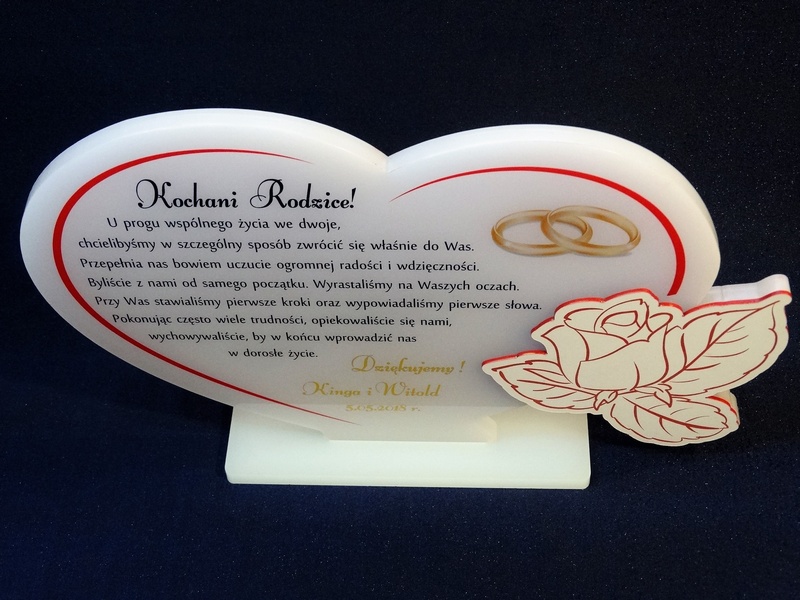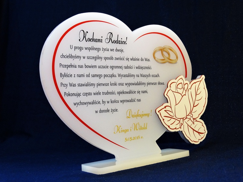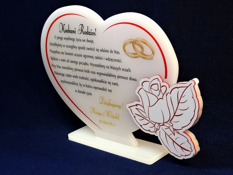 Na wyciętym z pleksy sercu wykonany jest nadruk dedykacji, życzeń oraz ozdobnej grafiki z podziękowaniem dla rodziców.