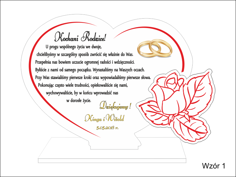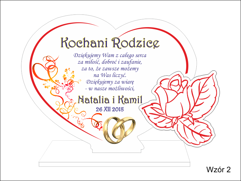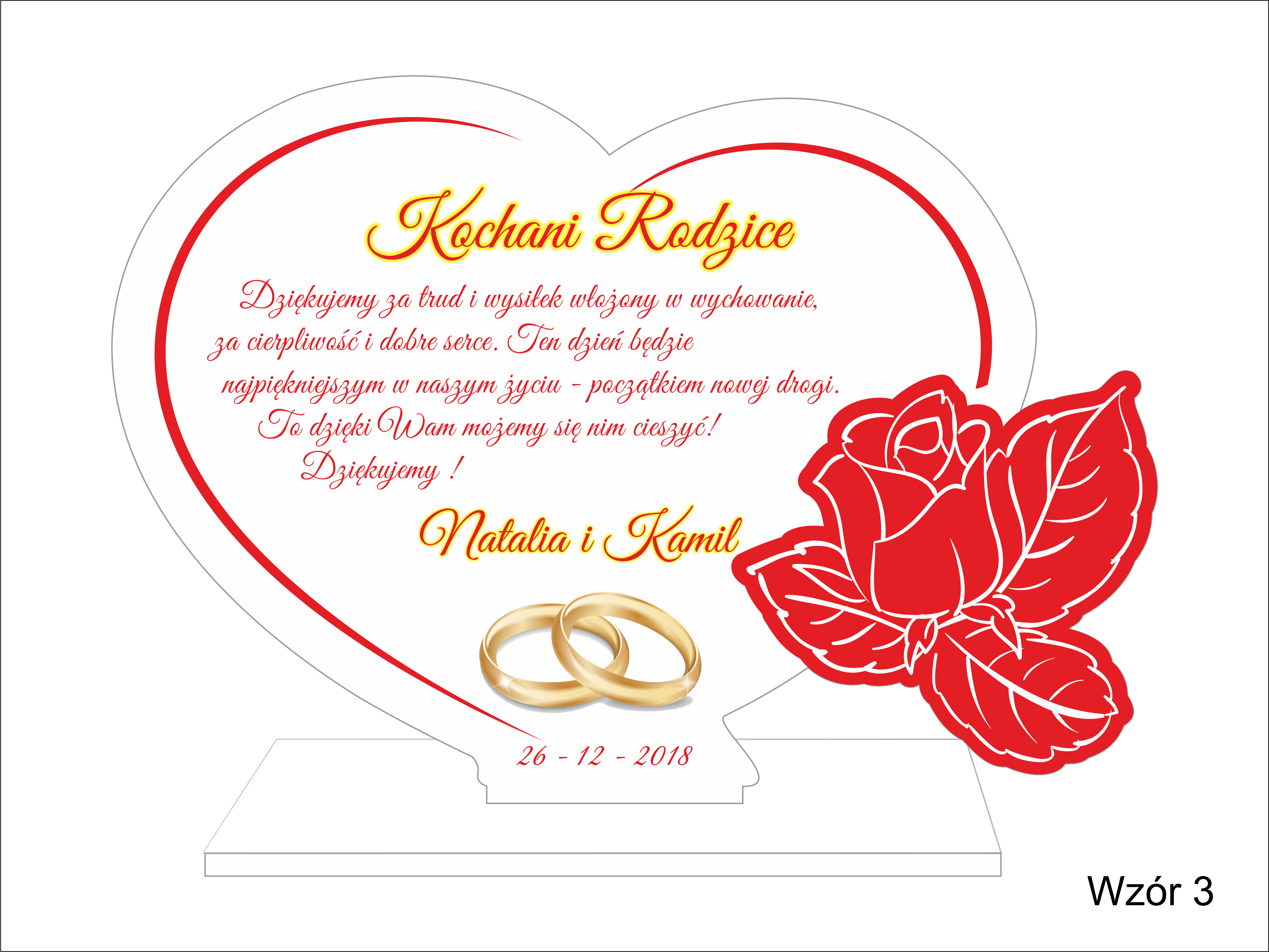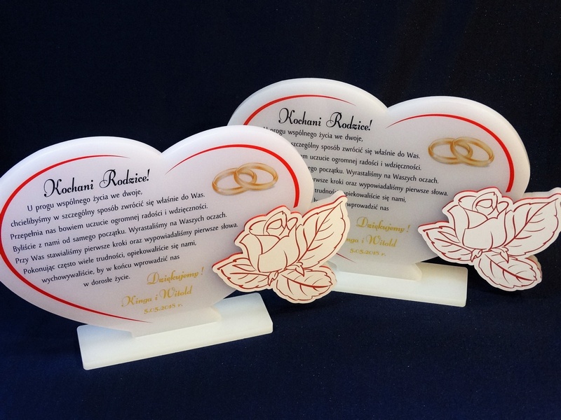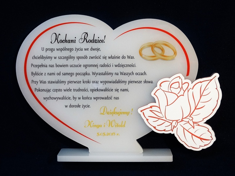 Na wyciętym z pleksy sercu wykonany jest nadruk dedykacji, życzeń oraz ozdobnej grafiki z podziękowaniem dla rodziców.