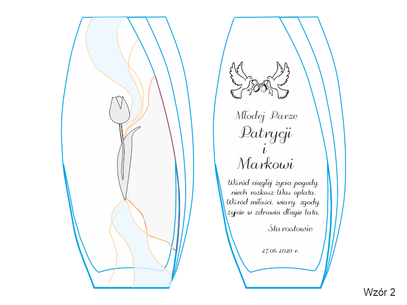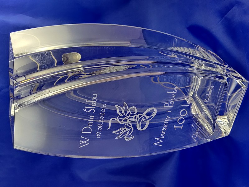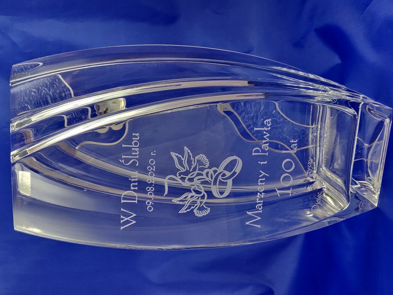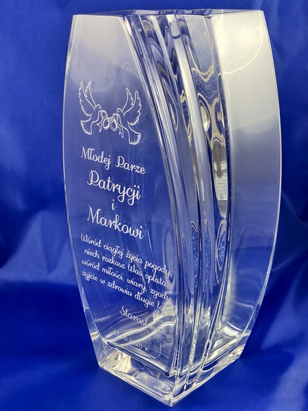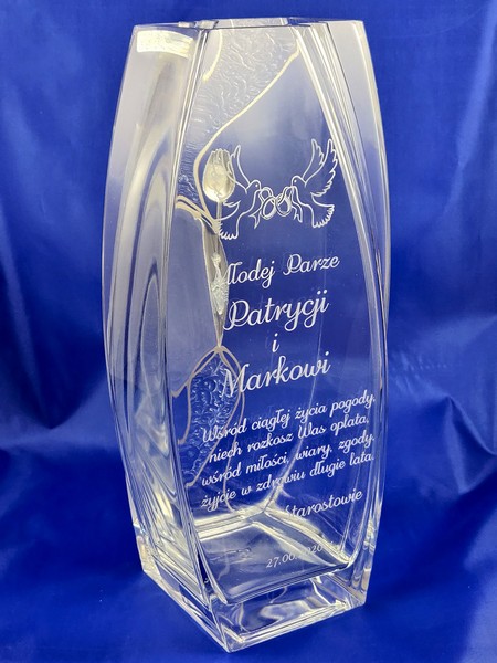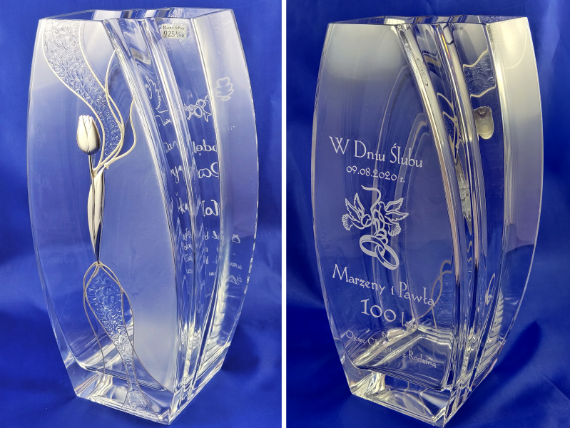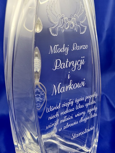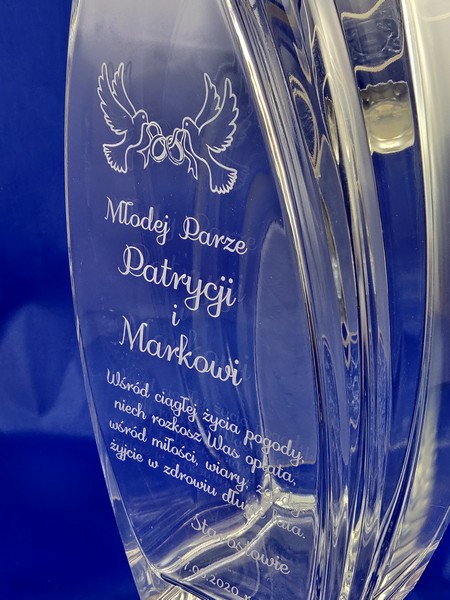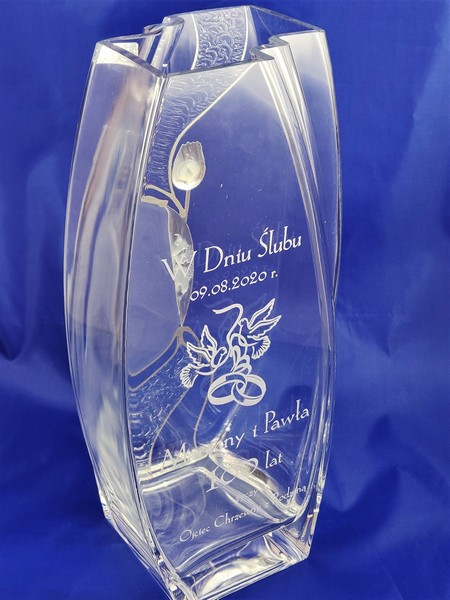 Na wazonie wykonany jest grawer dedykacji i ozdobnych grafik na pamiątkę zawarcia związku małżeńskiego.