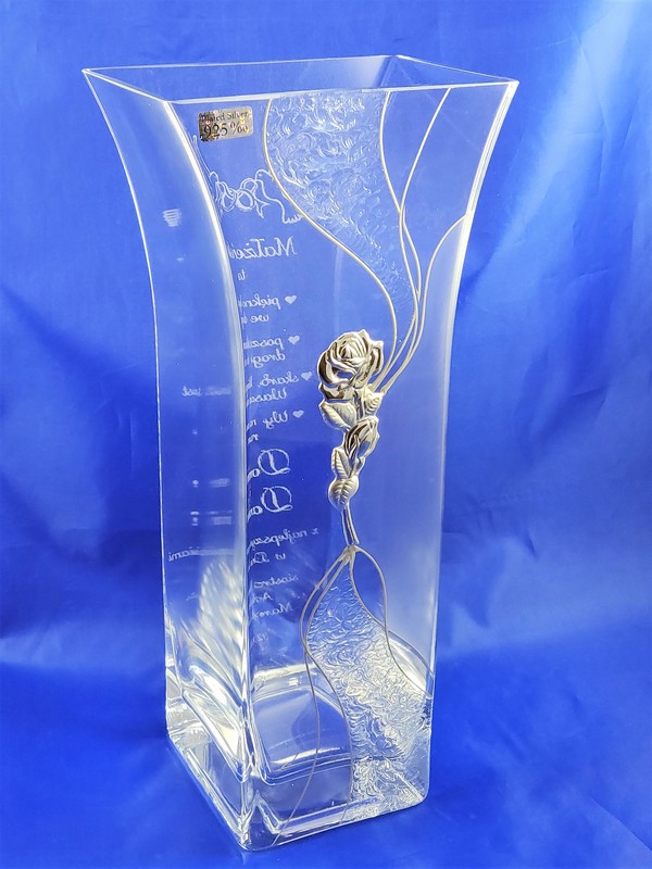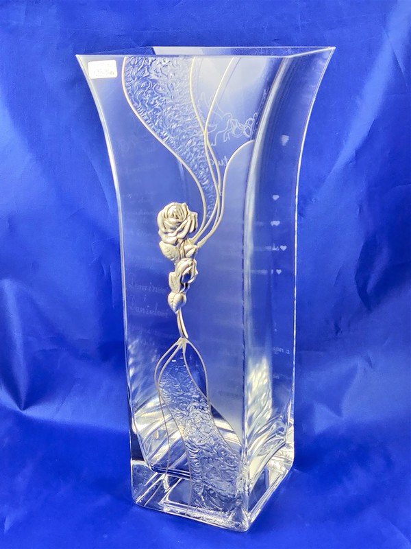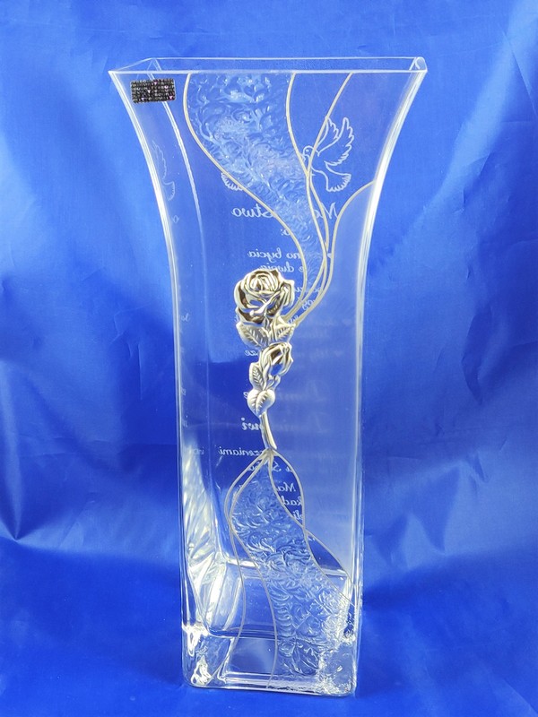 Prezent ślubny dla Państwa Młodych w postaci wazonu Alina zdobionego srebrną różą i grawerem dedykacji.