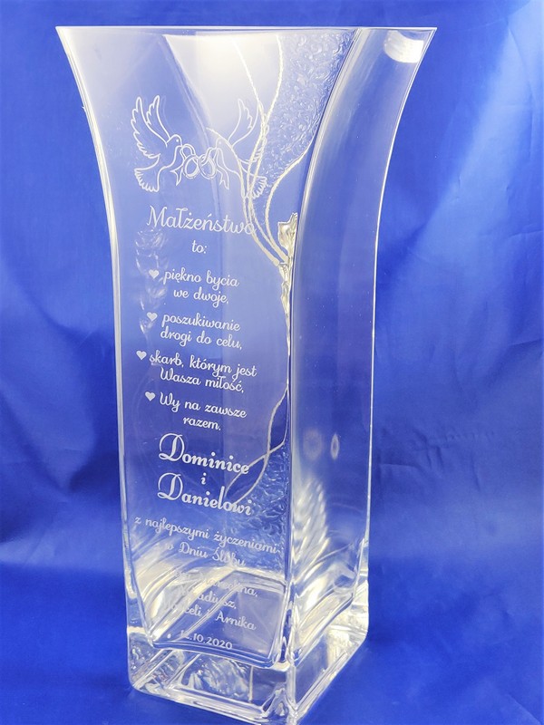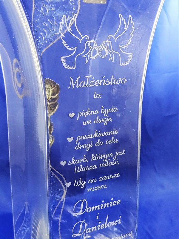 Na wazonie wykonany jest grawer ozdobnych grafik i dedykacji na pamiątkę ślubu.