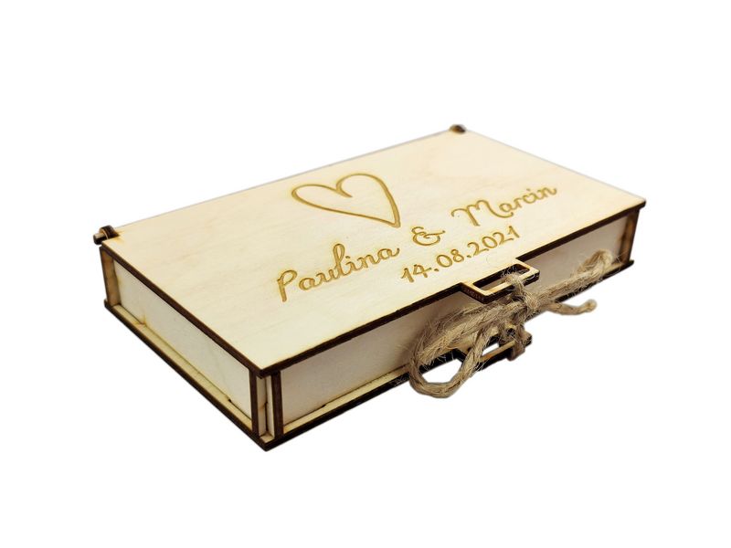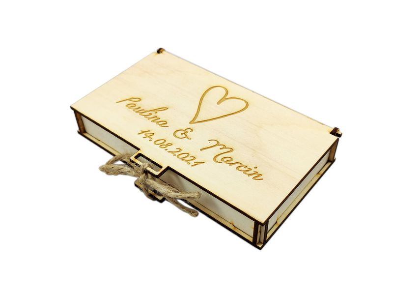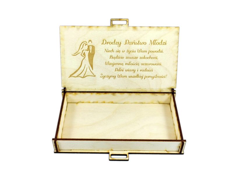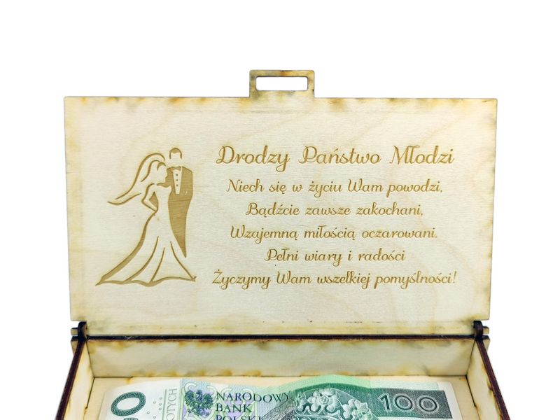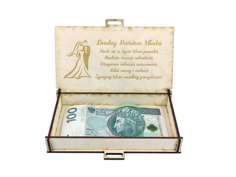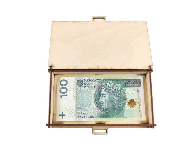 Pudełko na banknoty wykonane jest z drewnianej sklejki.