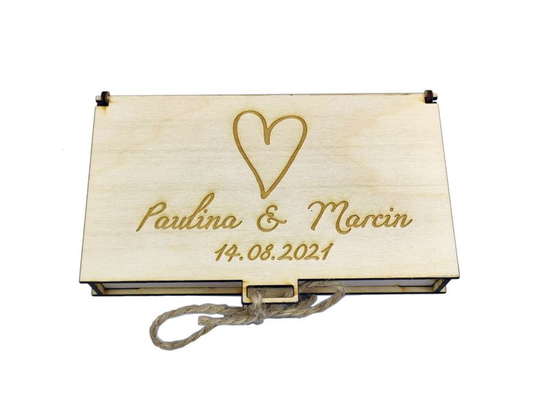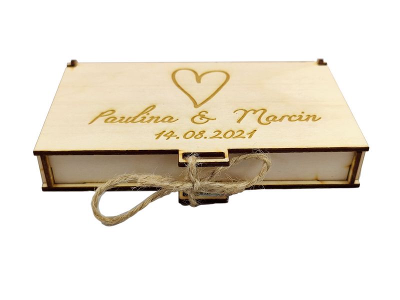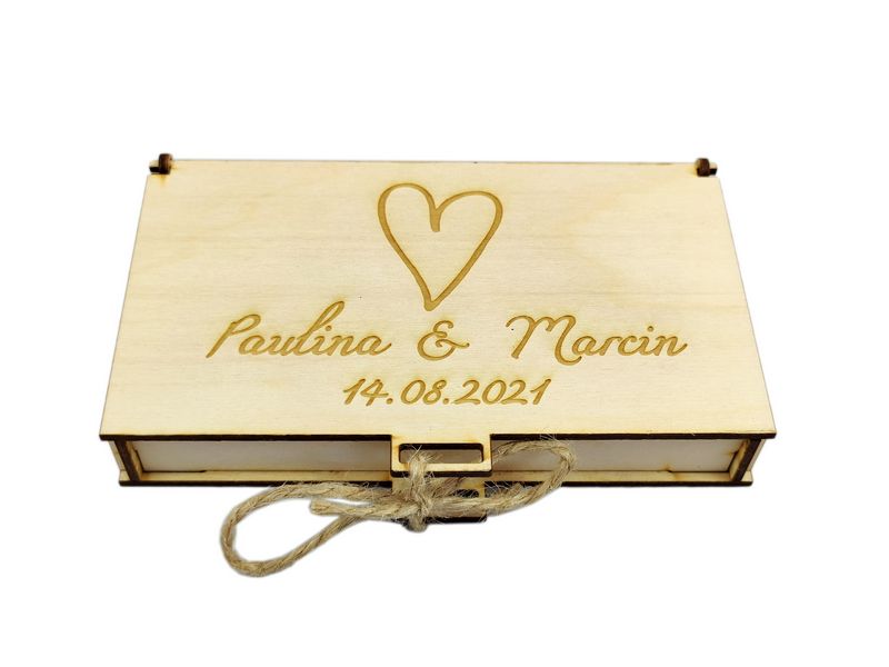Praktyczny upominek ślubny w postaci drewnianego pudełka na pieniądze z grawerem dedykacji.