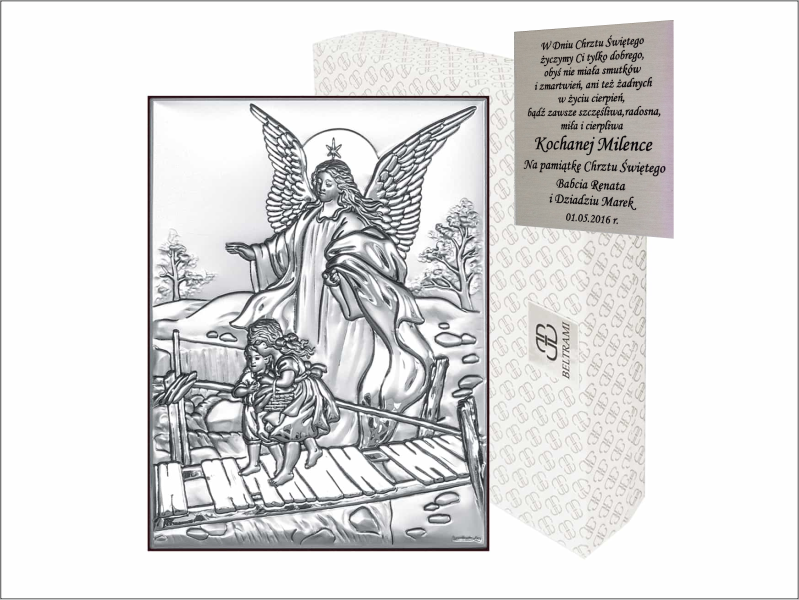 - obrazek srebrny przedstawiający Anioła Stróża z dziećmi na kładce