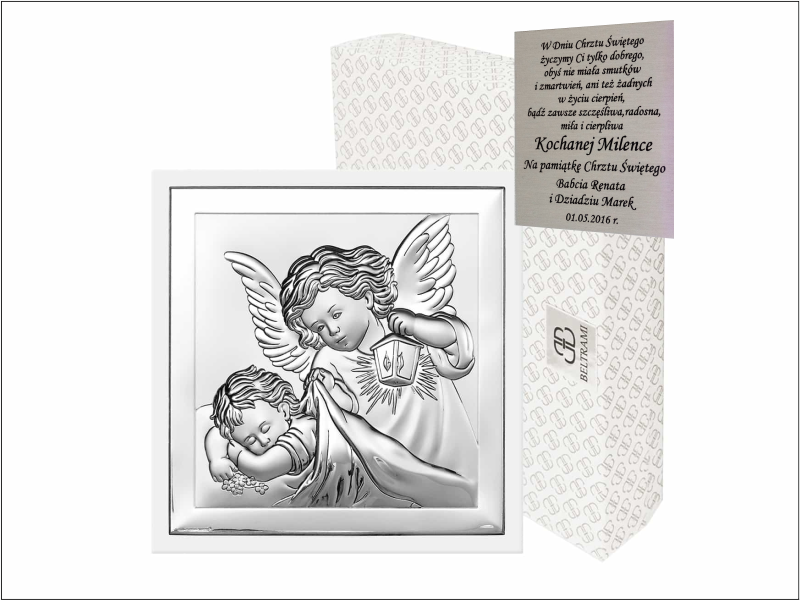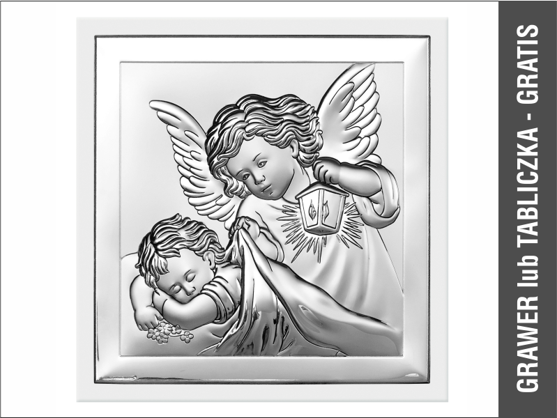 Srebrny Obrazek "Aniołek z latarenką nad dzieckiem 6387W kwadratowy z białą ramką".