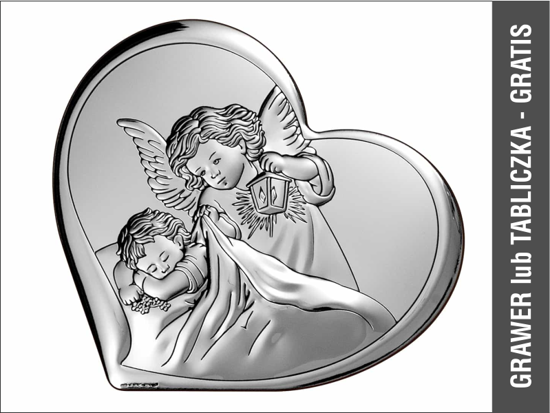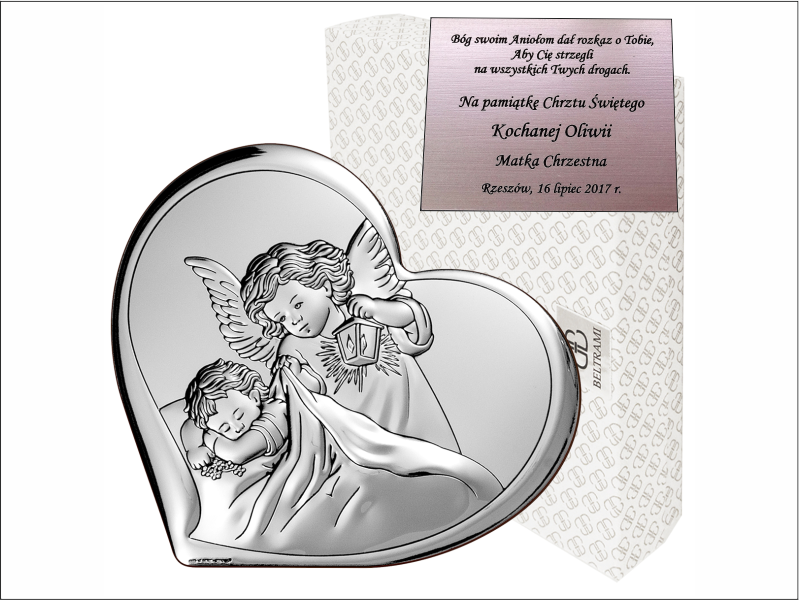 - obrazek srebrny w kształcie serca przedstawiający Aniołka z latarenką