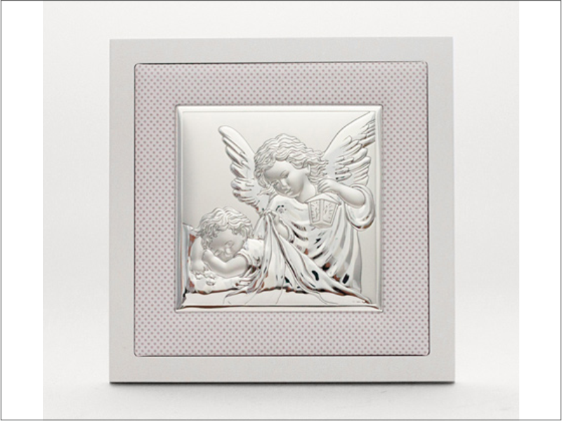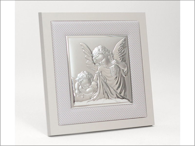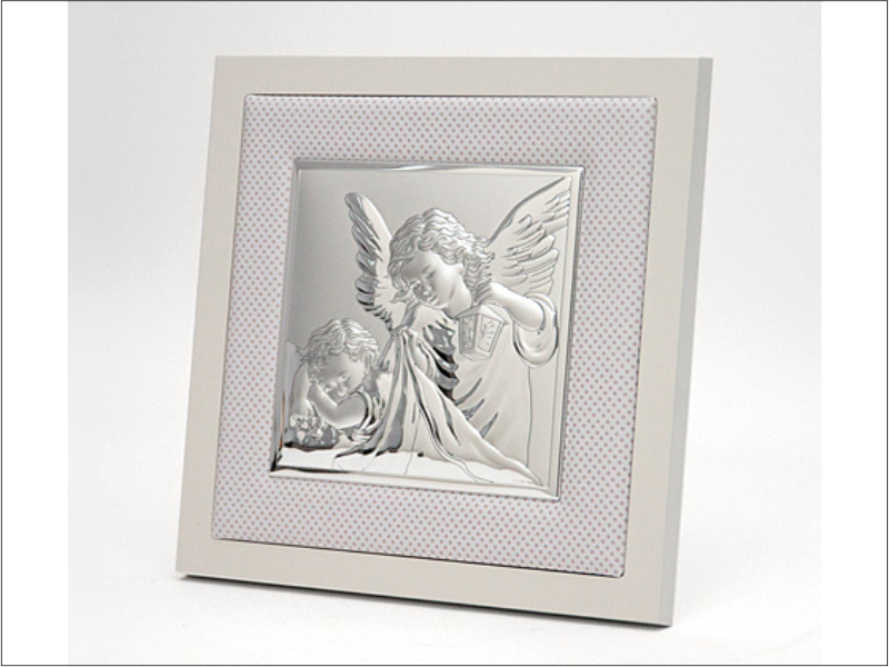 Srebrny Obrazek "Aniołek z latarenką nad dzieckiem na beżowym materiale z białą drewnianą ramką 75020/PA".