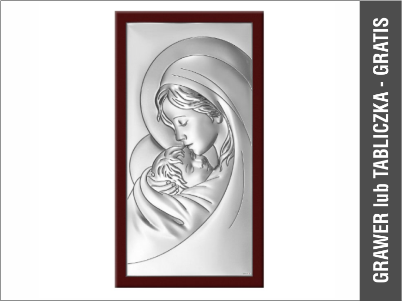 Srebrny Obrazek "Matka Boża z dzieciątkiem 6381WM" prostokątny na drewnianej ramce.