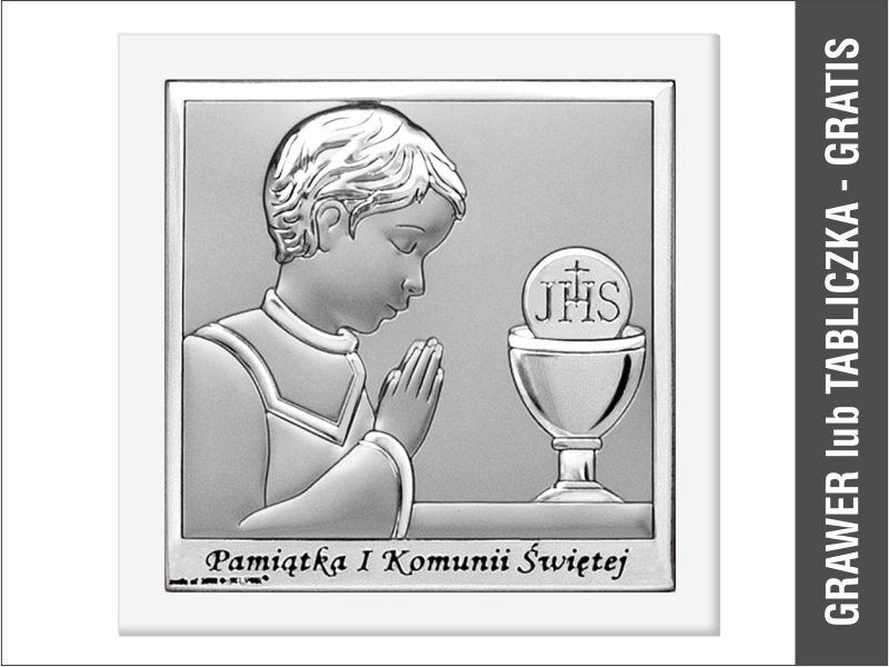 Srebrny Obrazek "Pamiątka I Komunii Św. dla chłopczyka kwadratowy z podpisem na białym drewnie 6568OW".
