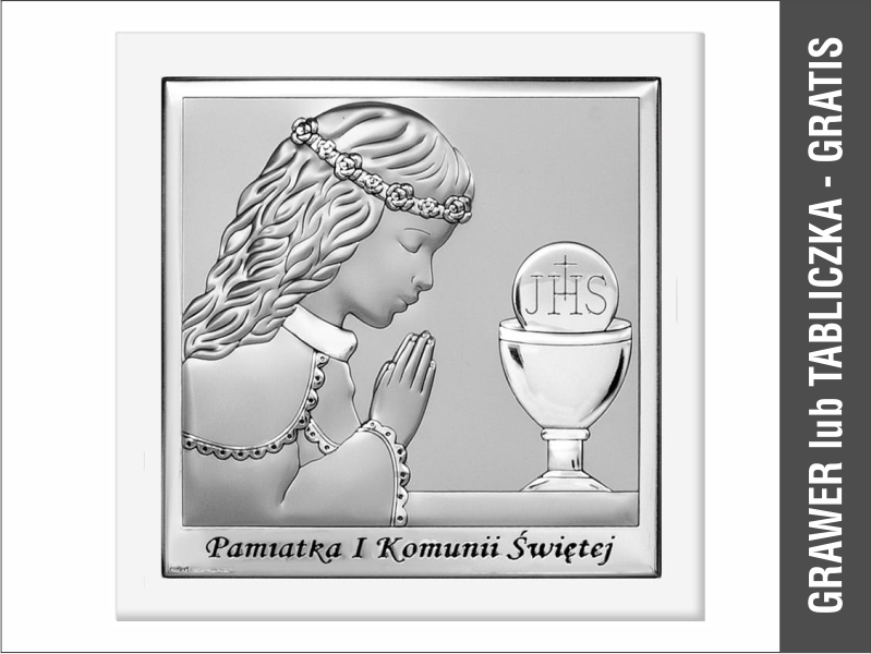 - obrazek srebrny przedstawiający wizerunek dziewczynki z Hostią i kielichem