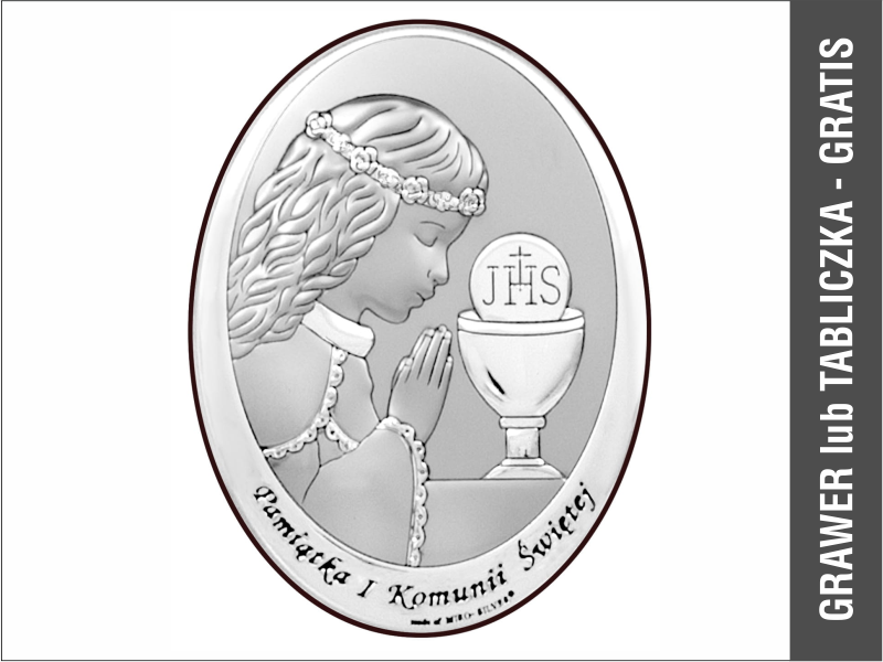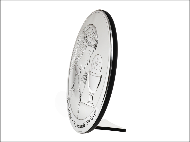 Srebrny Obrazek "Pamiątka I Komunii Św. dla dziewczynki z podpisem owalny 6571A".