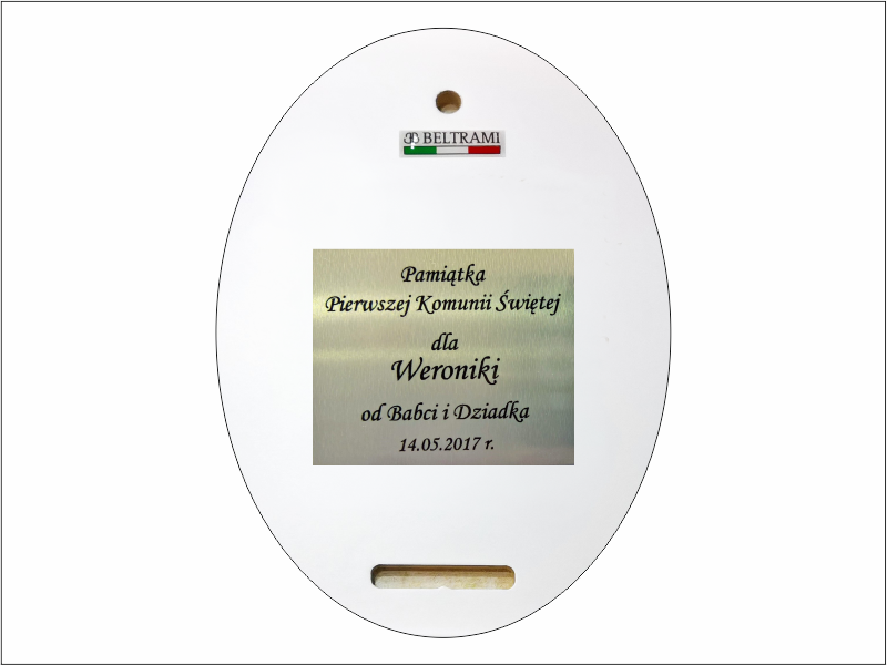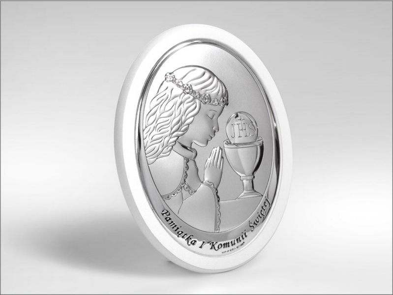 Srebrny Obrazek "Pamiątka I Komunii Św. dla dziewczynki owalny na drewnie z podpisem 6571AW".