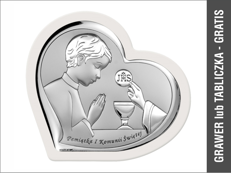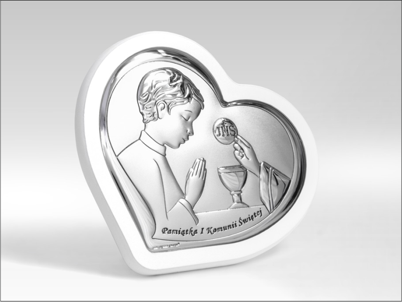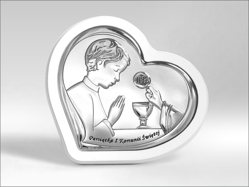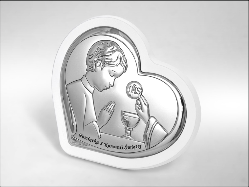 - obrazek srebrny w kształcie serca przedstawiający wizerunek chłopca przystępującego do Komunii Św.