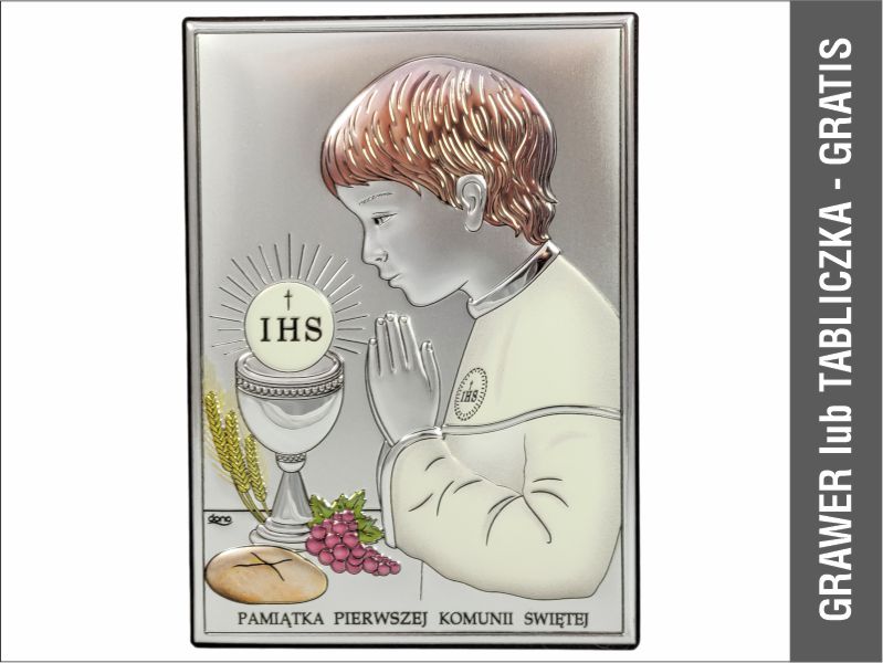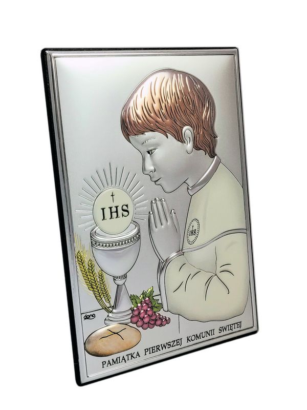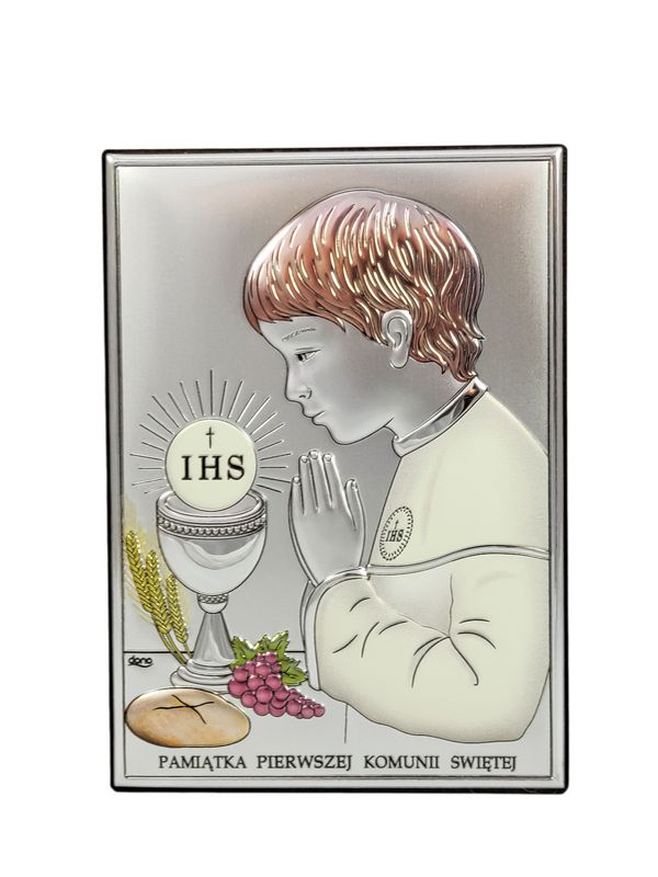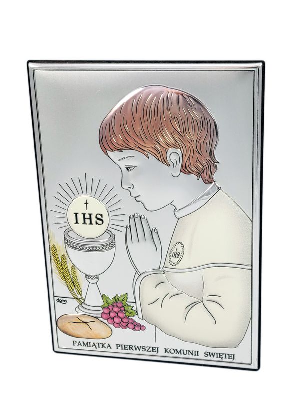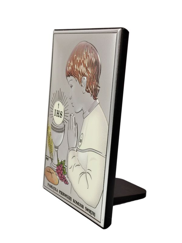 Srebrny obrazek prostokątny "Pamiątka I Komunii Świętej z chłopczykiem DS04/C" kolorowy.