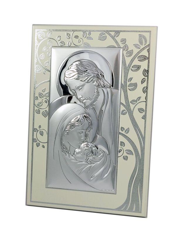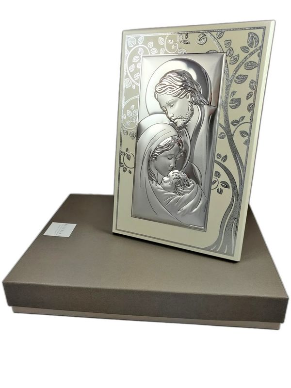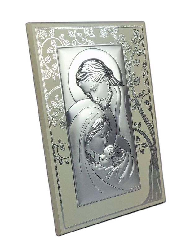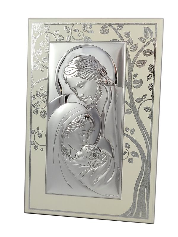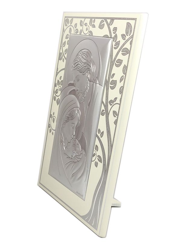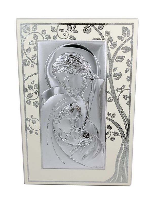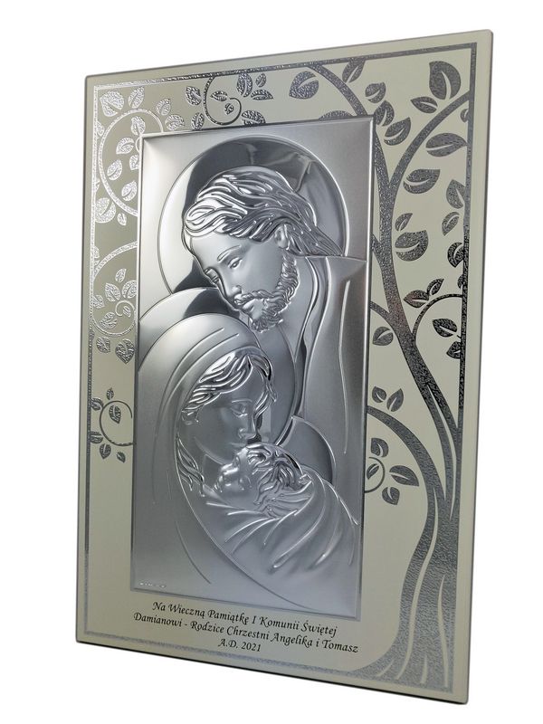 Srebrny obrazek "Święta Rodzina 6380P" na drewnianej białej ramie z ozdobnym drzewem.
