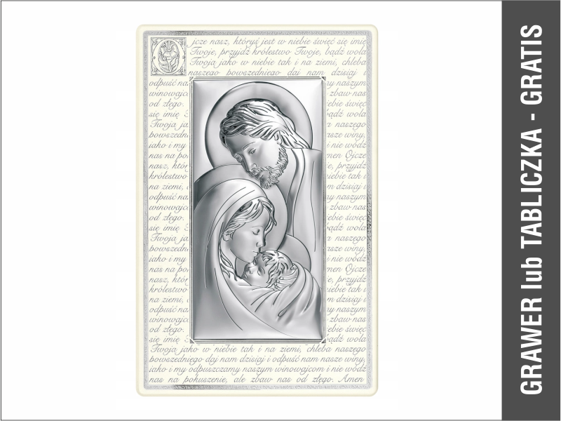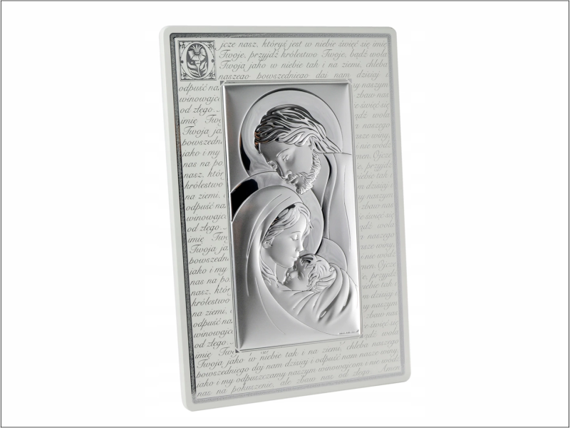 Srebrny Obrazek "Święta Rodzina 6380P" na drewnianej ramce z modlitwą.