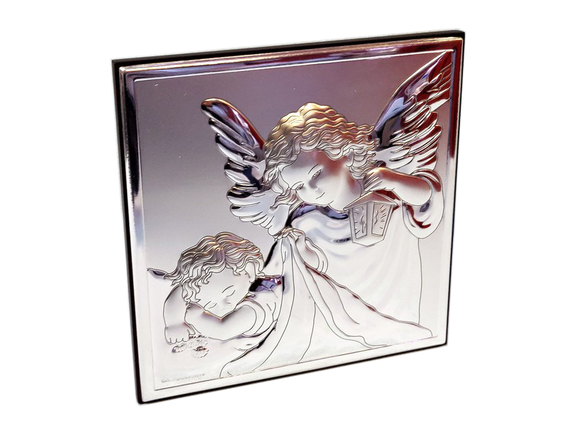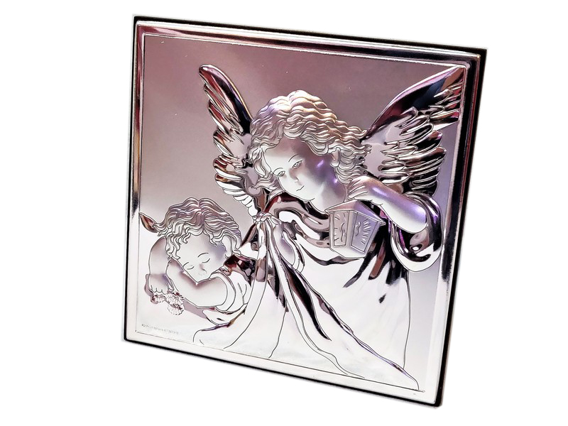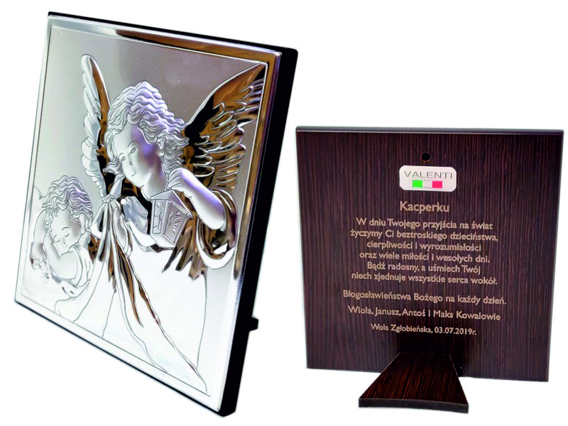 Srebrny Obrazek "Aniołek z latarenką nad dzieckiem 81200 o kwadratowym kształcie" z wygrawerowaną pamiątkową dedykacją z okazji narodzin dziecka.