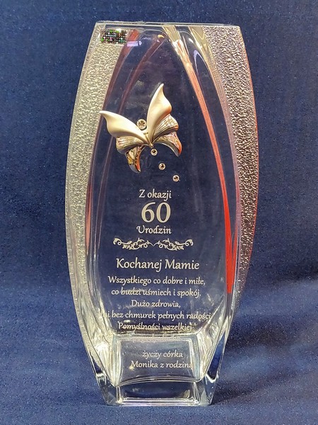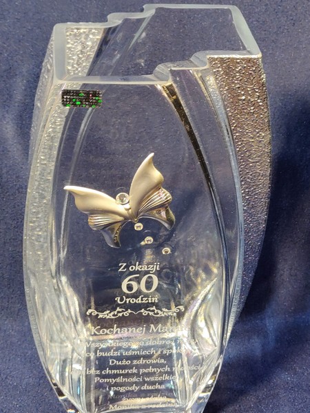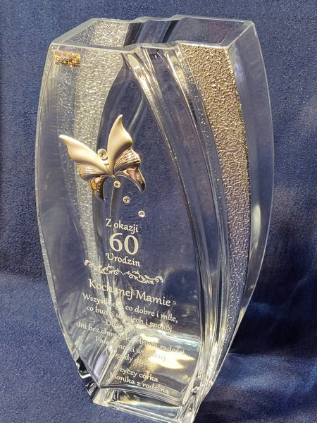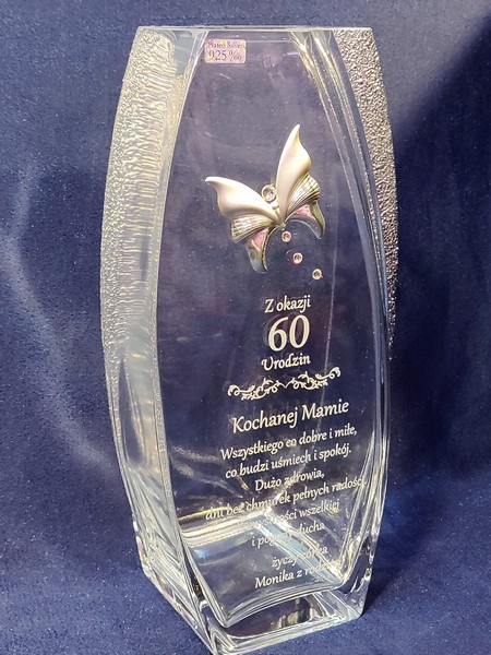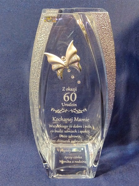 Prezent na urodziny w postaci wazonu szklanego Butterfly zdobionego posrebrzanym motylem z kryształkami i grawerem.