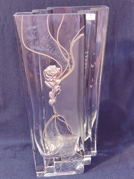 Wazon ma prostokątny kształt z bocznymi schodkami. Wazon ozdobiony jest umieszczonym centralnie pięknym kwiatem róży.