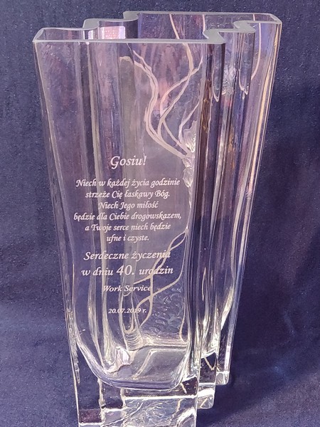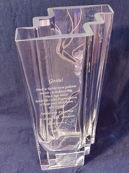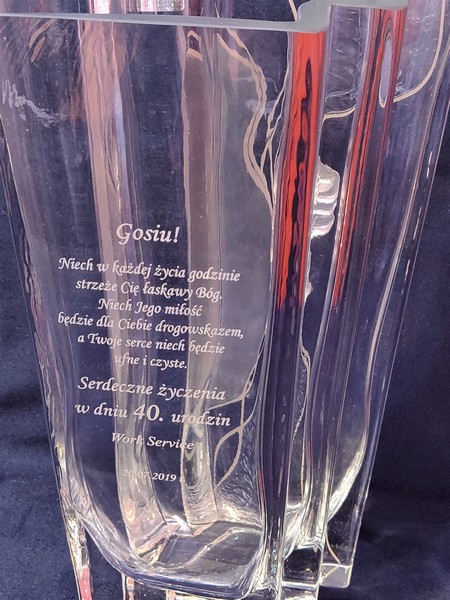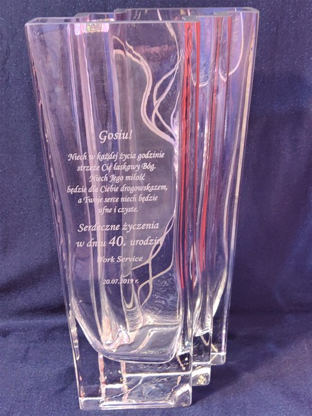 Na wazonie wykonany jest grawer indywidualnej dedykacji z okazji urodzin.