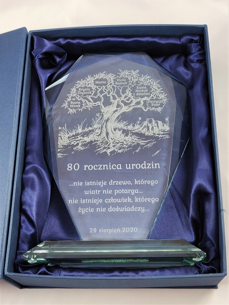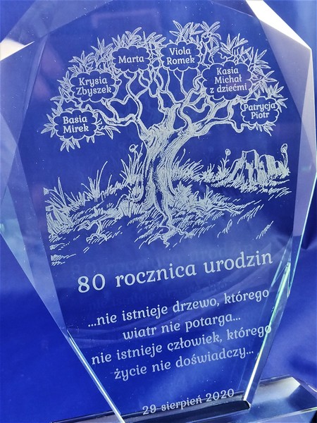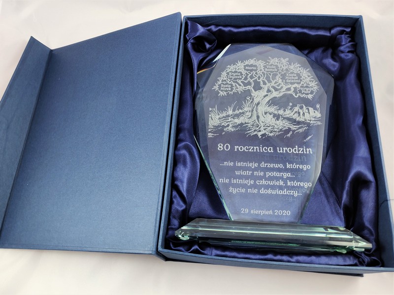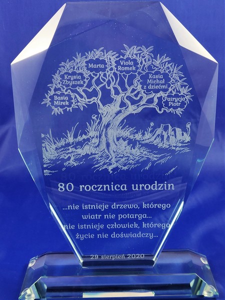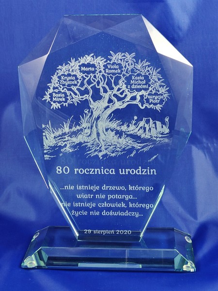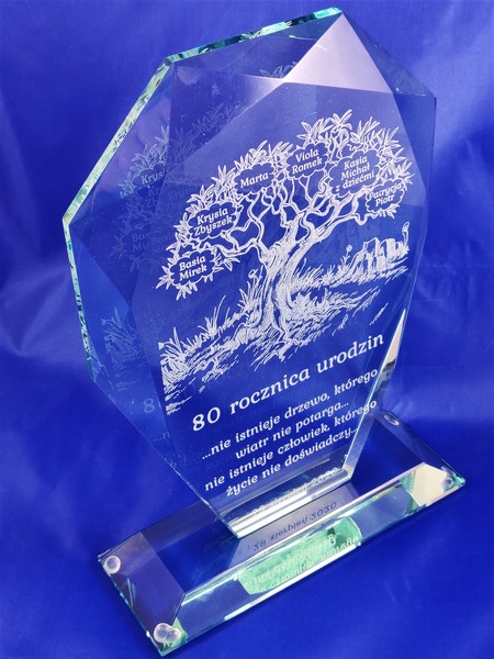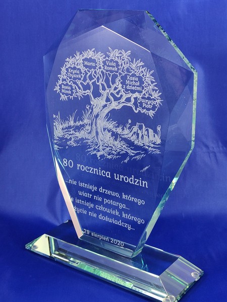 Grawer z okazji urodzin można wykonać także na innych modelach statuetek szklanych.