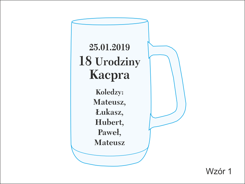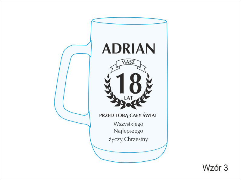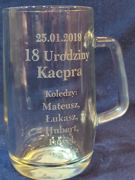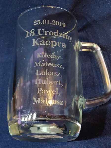 Wygrawerowany kufel może w szczególności sprawdzić się jako upominek z okazji 18-stych Urodzin.