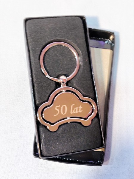 Upominek z okazji urodzin w postaci metalowego breloczka w kształcie auta z grawerem dedykacji.