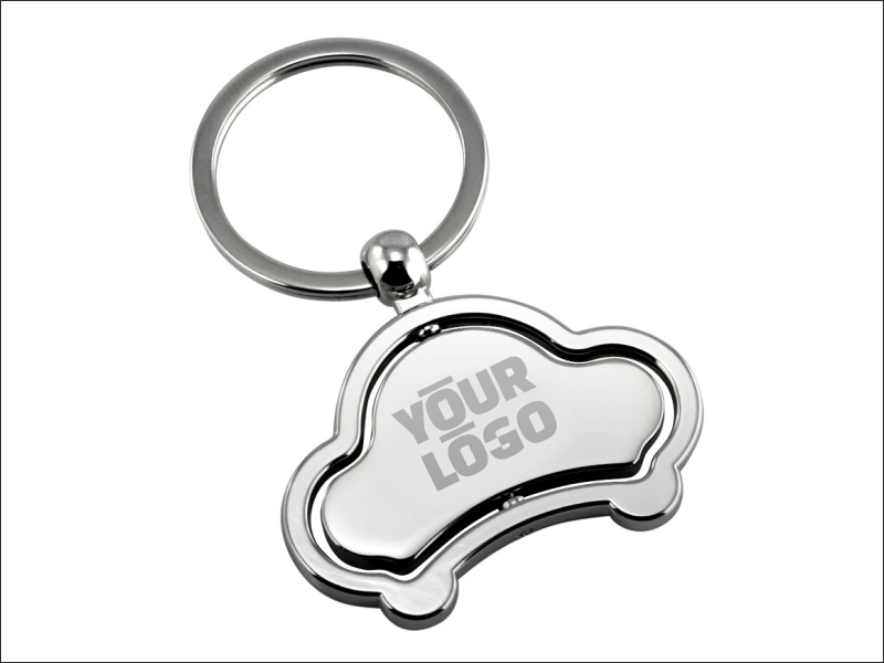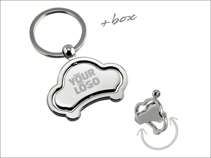 Brelok metalowy jest obrotowy i ma kształt samochodu. Wykończenie breloka to chrom polerowany.