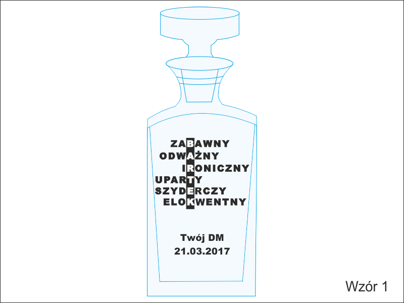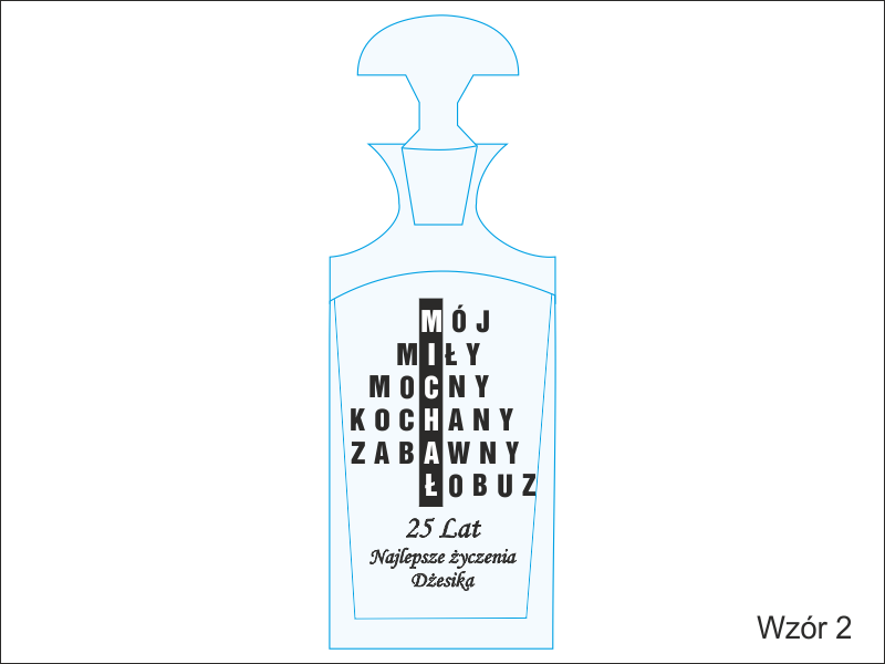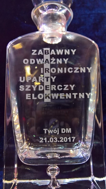 Na karafce wykonany jest grawer ozdobników i dedykacji z okazji Urodzin w formie krzyżówki.